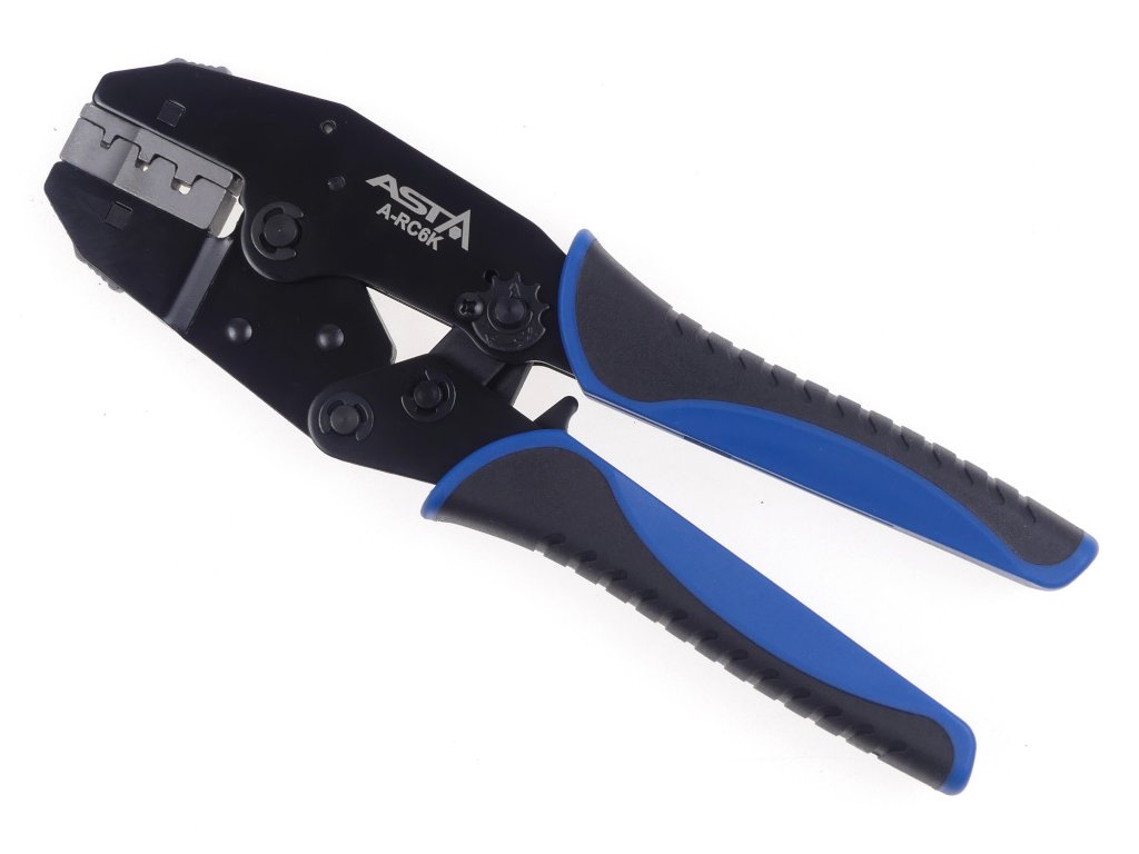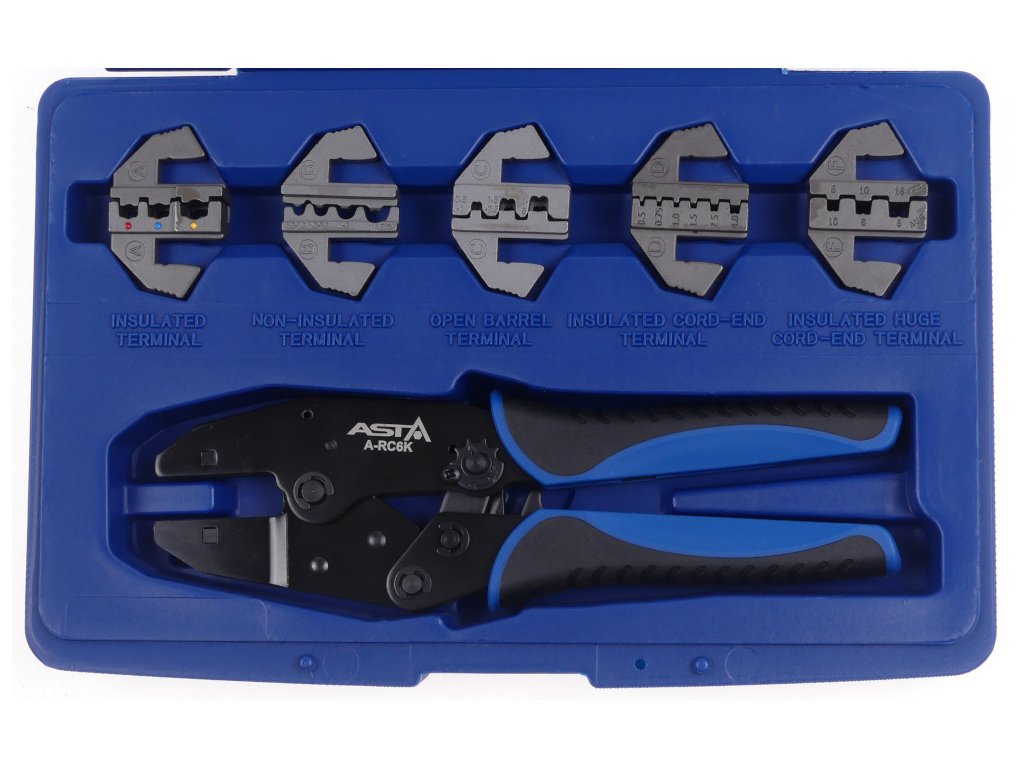 Kleště elektrikářské, krimpovací – lisovací tzv. „krimpovačky“ na elektrické konektory 0,5 - 16 mm2, 5 výměnných matric, pro neizolované i izolované kabelové svorky a konektory (koncovky) různých druhů, s aretací (ráčnovým systémem) – ASTA A-RC6K.