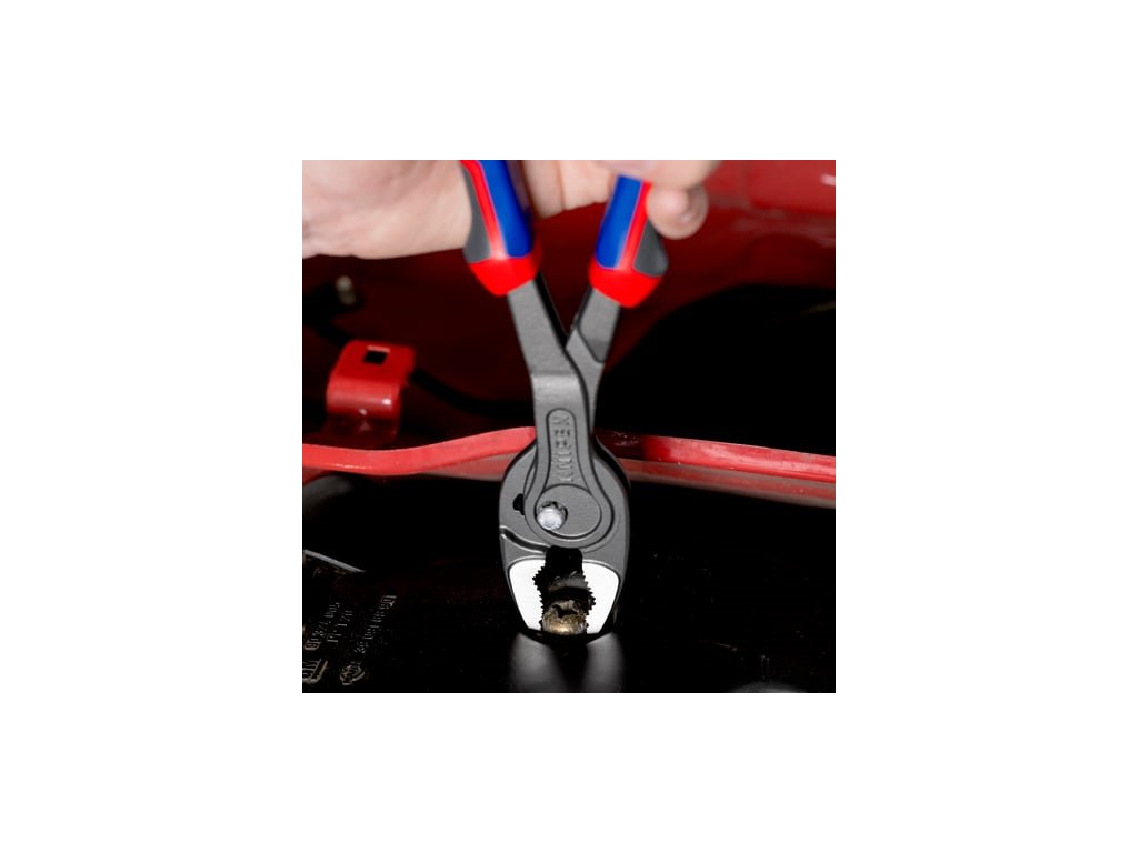 Kleště jsou vybaveny zarážkou sevření, která snižuje riziko skřípnutých prstů, a robustní průvlečný kloub zajišťuje dlouhou životnost nástroje. Tento nástroj je schopen silně uchopit i velké, velmi těsné a hluboko uložené součásti s A/F rozsahem 5–27 mm. Komfortní rukojeti, složené ze tří ergonomických komponent, zajišťují optimální manipulaci. Nástroj je také vybaven dvěma rozhraními KNIPEXtend pro případné rozšíření funkcí.