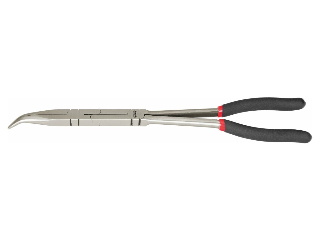 Prodloužené kleště s půlkulatými zahnutými čelistmi (45°) a se zdvojeným kloubem jsou vyrobeny ze speciální oceli.