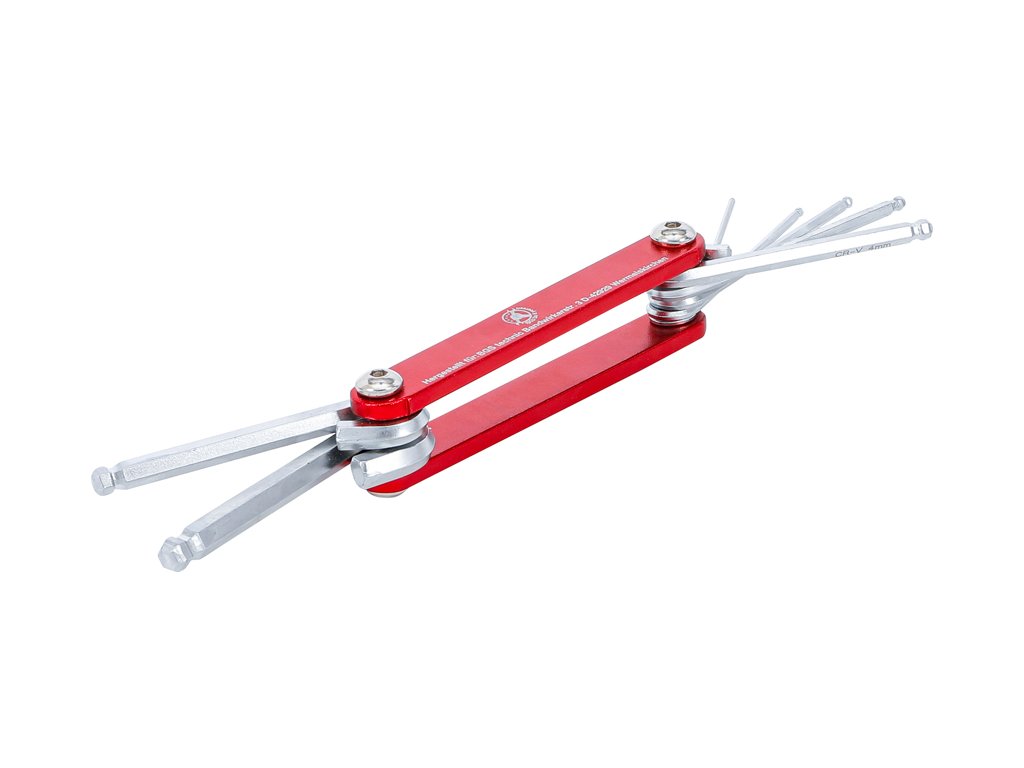 Tzv. L-klíče s šestihranným imbusovým profilem ve všech obvyklých rozměrech. Klíče jsou vyklápěcí, umístěné v držáku z eloxovaného hliníku. Díky tomu se snadno vejdou do kapsy apod. Ideální pro údržbáře apod.