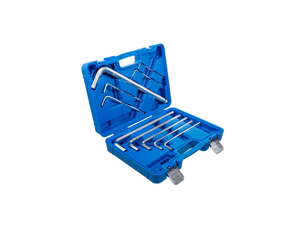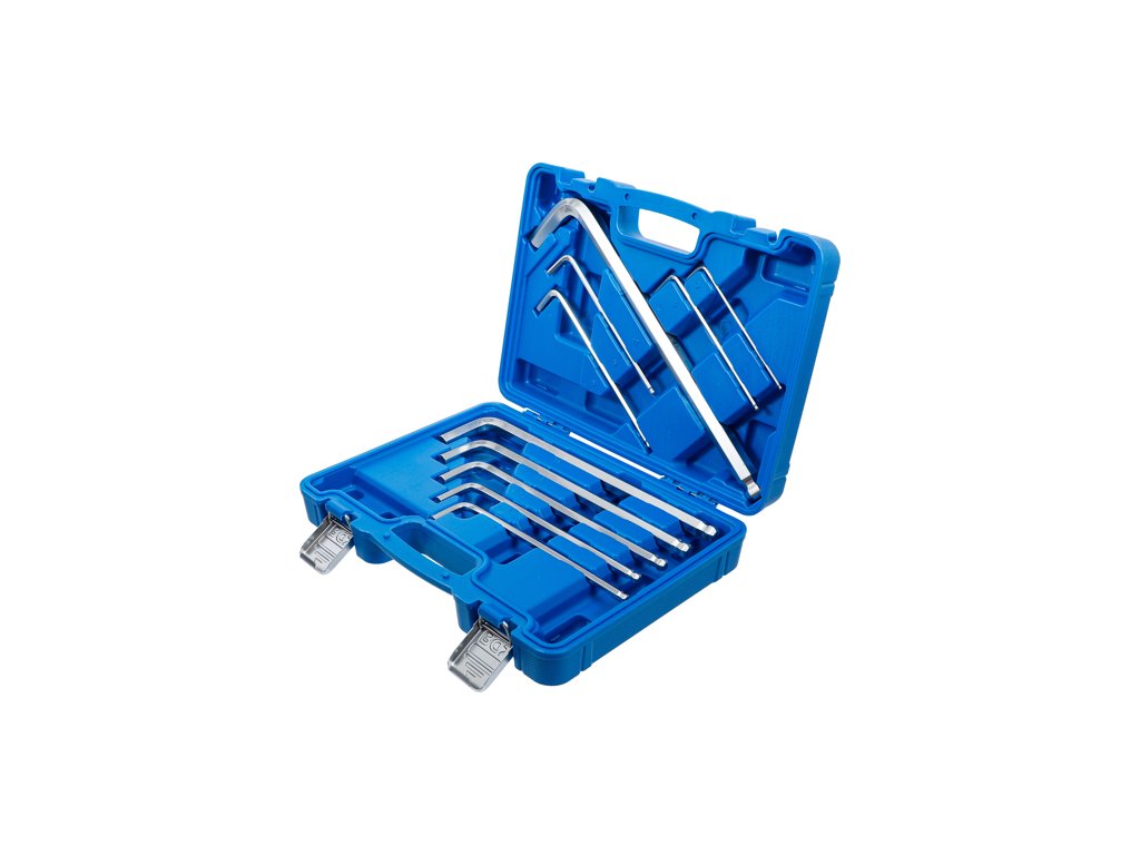 Sada zahnutých „L-klíčů“ Imbus (HEX), rozměry H3 až H17, extra velké provedení MAX, dlouhá strana s kuličkou, sada 10 dílů v plastovém kufru s kovovými přezkami - BGS technic 795