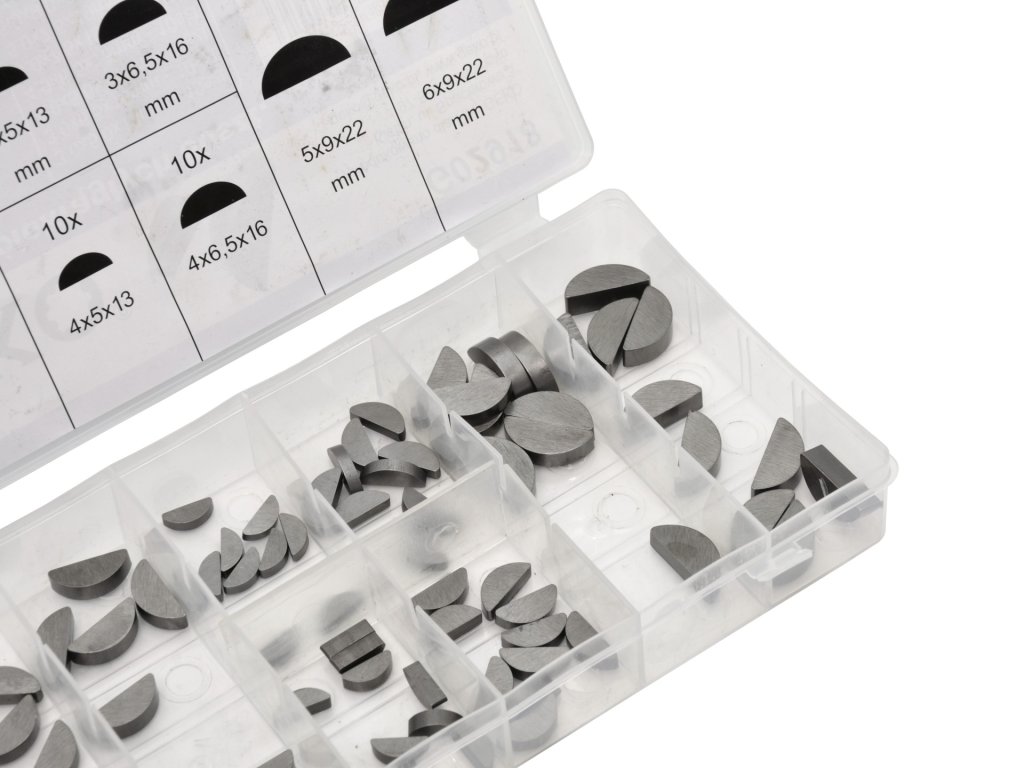 Polokruhové klíny – kruhová Woodruffova pera, různé rozměry, sada 80 ks v plastové krabičce – GEKO G02918