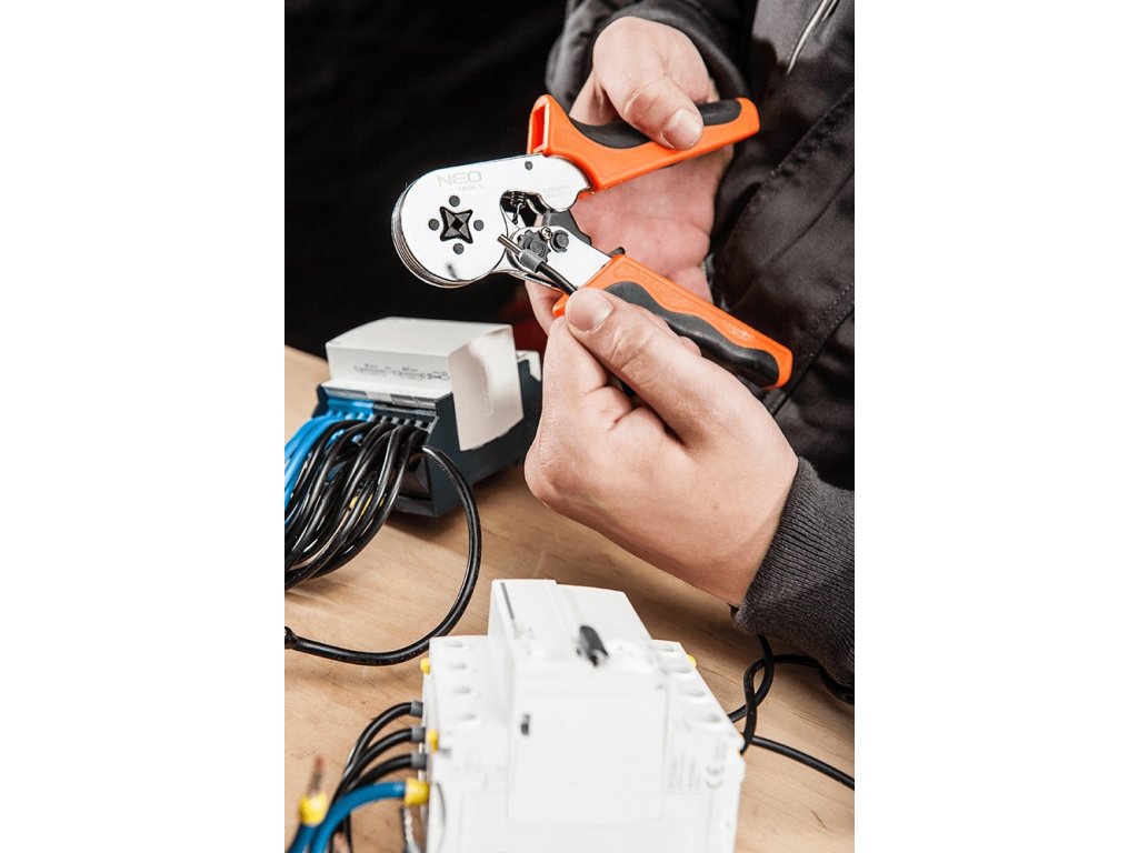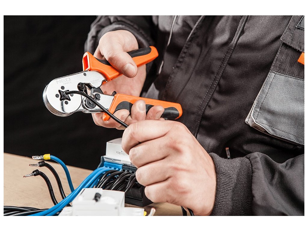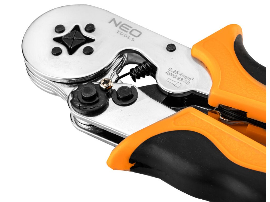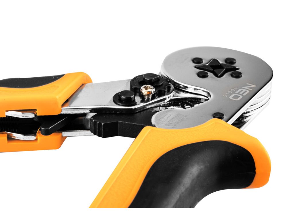 Elektrikářské kleště na krimpování – lisování dutinových konektorů (dutinek), tzv. „krimpovačky“, 4hranné, se samo nastavovacím systémem – NEO tools 01-507.