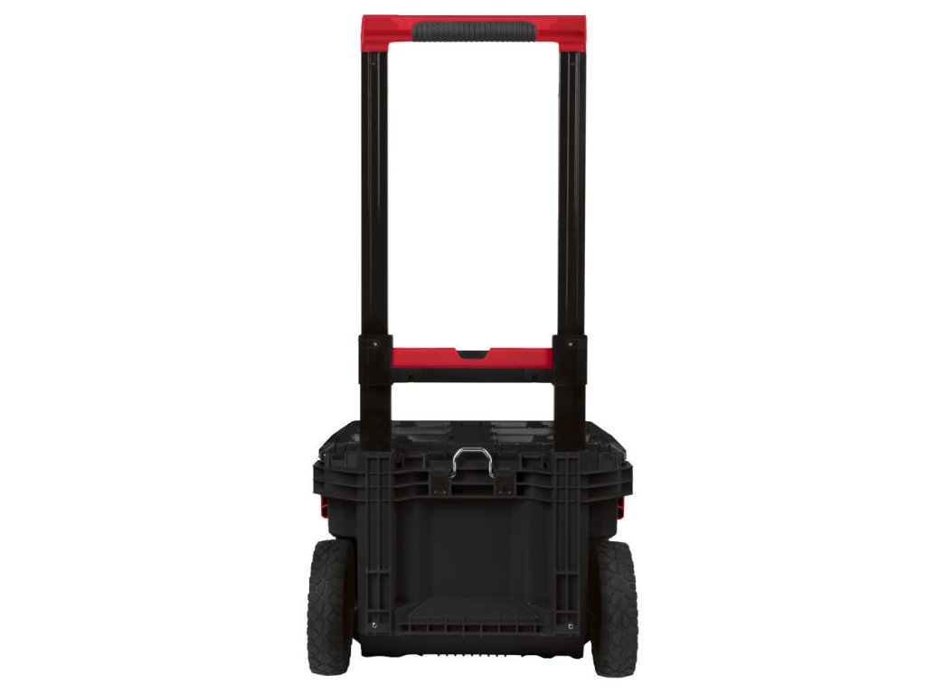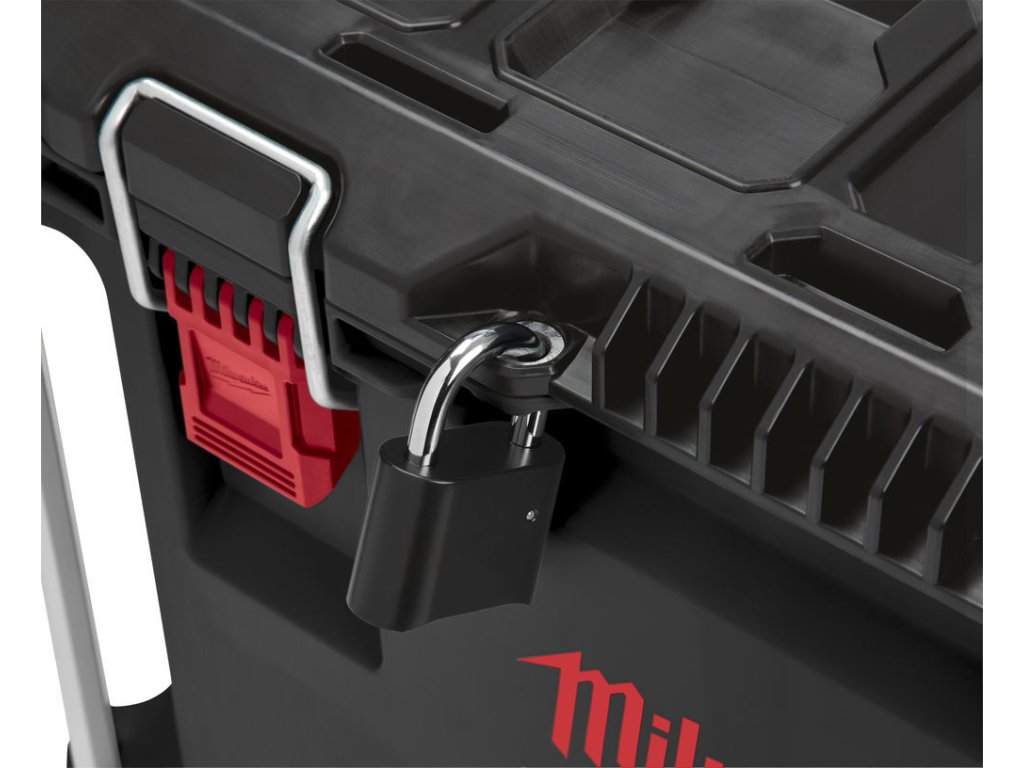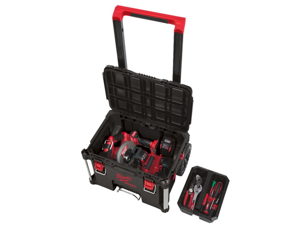 Kufr – box na nářadí 56x41x48 cm, pojízdný s velkými kolečky, vysunovací rukojeť, kovové rohy a zavírací přezky – Milwaukee Packout 4932464078