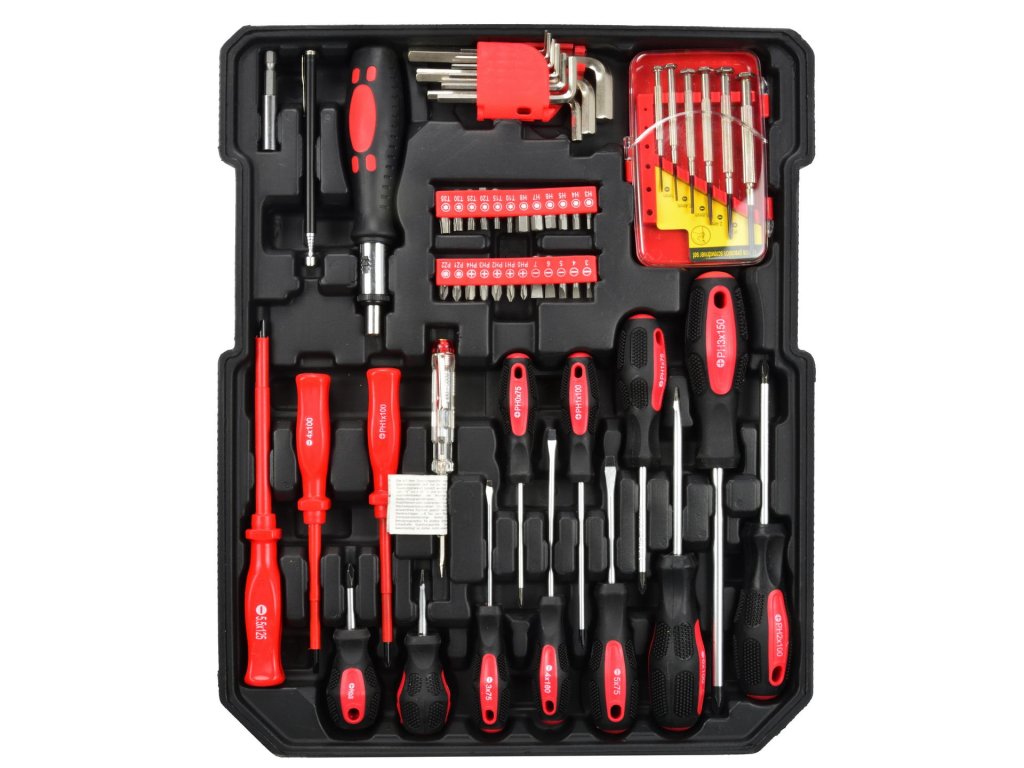Rozsáhlý a prakticky sestavený 187dílný set šroubováků, klíčů, gola sady a dalšího dílenského vybavení. Obsahuje nejčastěji používané druhy nářadí a potřeby.
