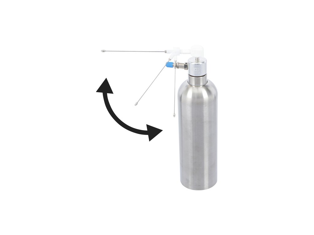 Se sklopenou rozprašovací jehlou vytváří mlhu, s vyklopenou jehlou vytváří úzký proud.
