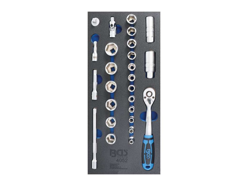 Prakticky vybavená vložka do dílenského vozíku se sadou 26 dílů hlavic Pro Torque od německého výrobce BGS Technic je užitečným doplňkem každé dílny či autoservisu.