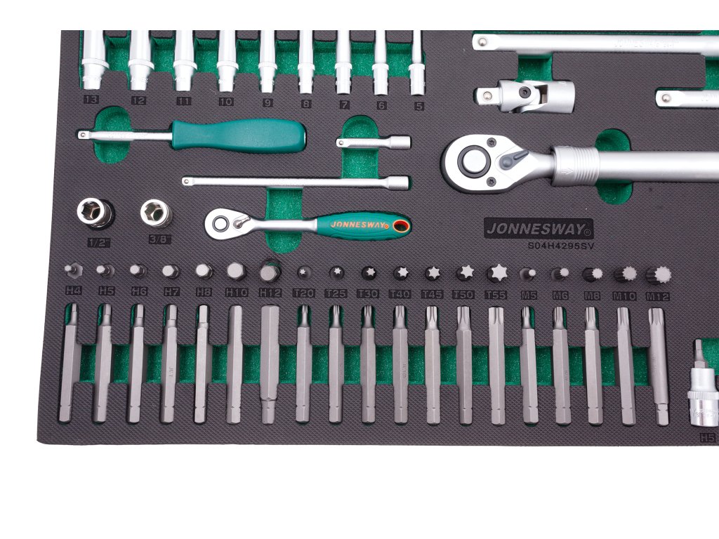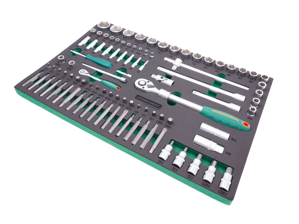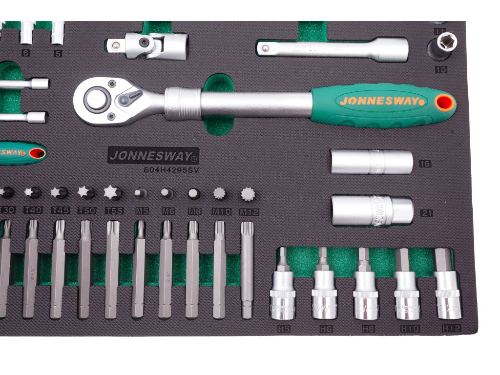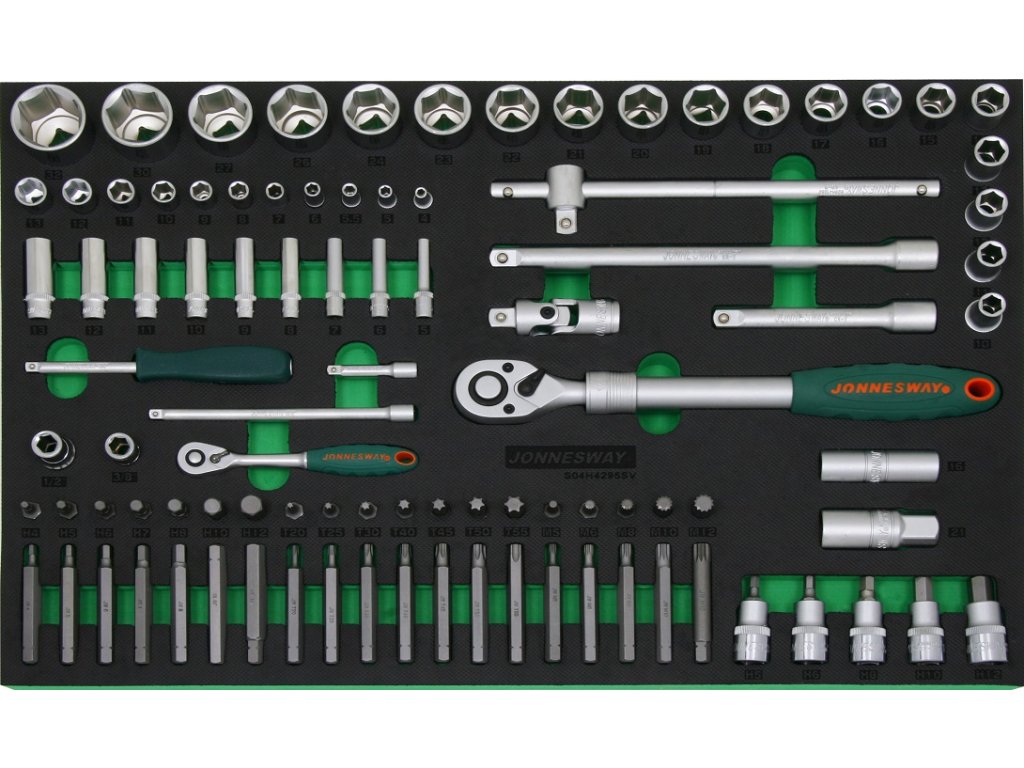 Pěnový modul EVA, vel. „C“ (570 x 380 mm): Rozsáhlá gola sada 95 dílů s ráčnou a příslušenstvím, vodicí čtyřhrany 1/4” a 1/2” – JONNESWAY S04H4295SV