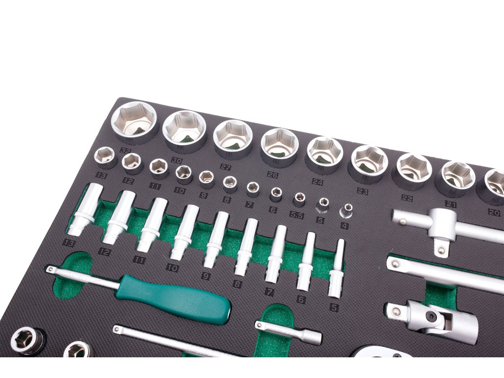 Praktická sada nářadí pro profesionály. Obsahuje všechny základní velikosti ořechů, které uživatel v dílně či autoservisu využije. K tomu nabízí bohatý výběr dalšího příslušenství – bity, klíče na svíčky, vratidla atd.