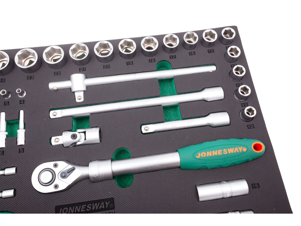Vše je v profesionální kvalitě a zabalené v praktickém pořadači. Každá součást soupravy v ní má svoje místo, a navíc máte přehled, zda něco nechybí. Sadu (modul) lze využít jako vybavení pro nářaďové dílenské vozíky značky JONNESWAY nebo QUATROS, případně i samostatně.