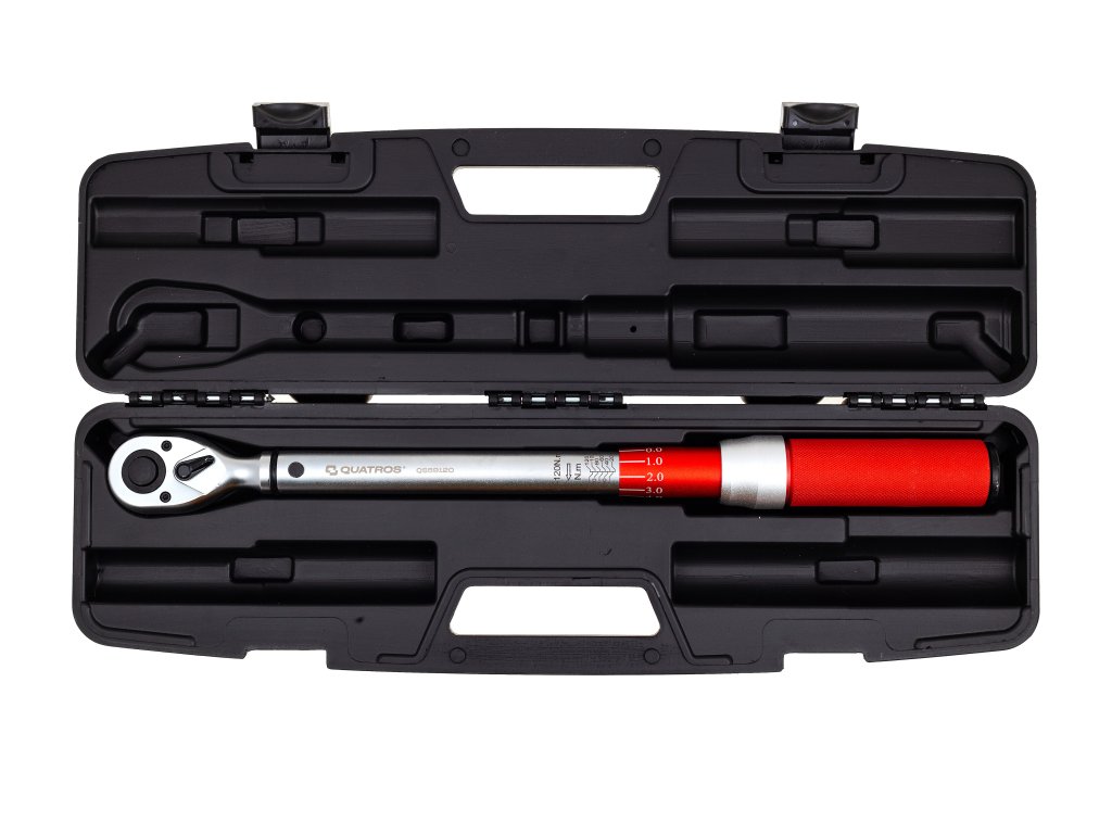 Momentový klíč „momenťák“ s rozsahem 20-120 Nm, čtyřhran 1/2”, vysoce přesný, přepínání vlevo-vpravo, s kalibračním certifikátem v češtině, v plastové kazetě – QUATROS QS59120