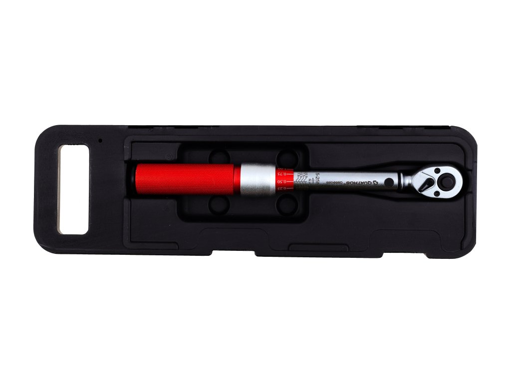 Momentový klíč „momenťák“ s rozsahem 5-25 Nm, čtyřhran 1/4”, vysoce přesný, přepínání vlevo-vpravo, s kalibračním certifikátem v češtině, v plastové kazetě – QUATROS QS59025