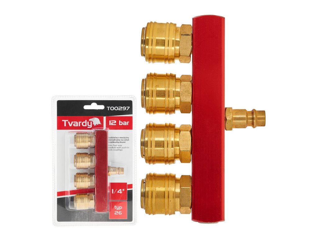 Mosazný vzduchový samčí konektor, 4cestný rozbočovač 1/4" s rychlými konektory
