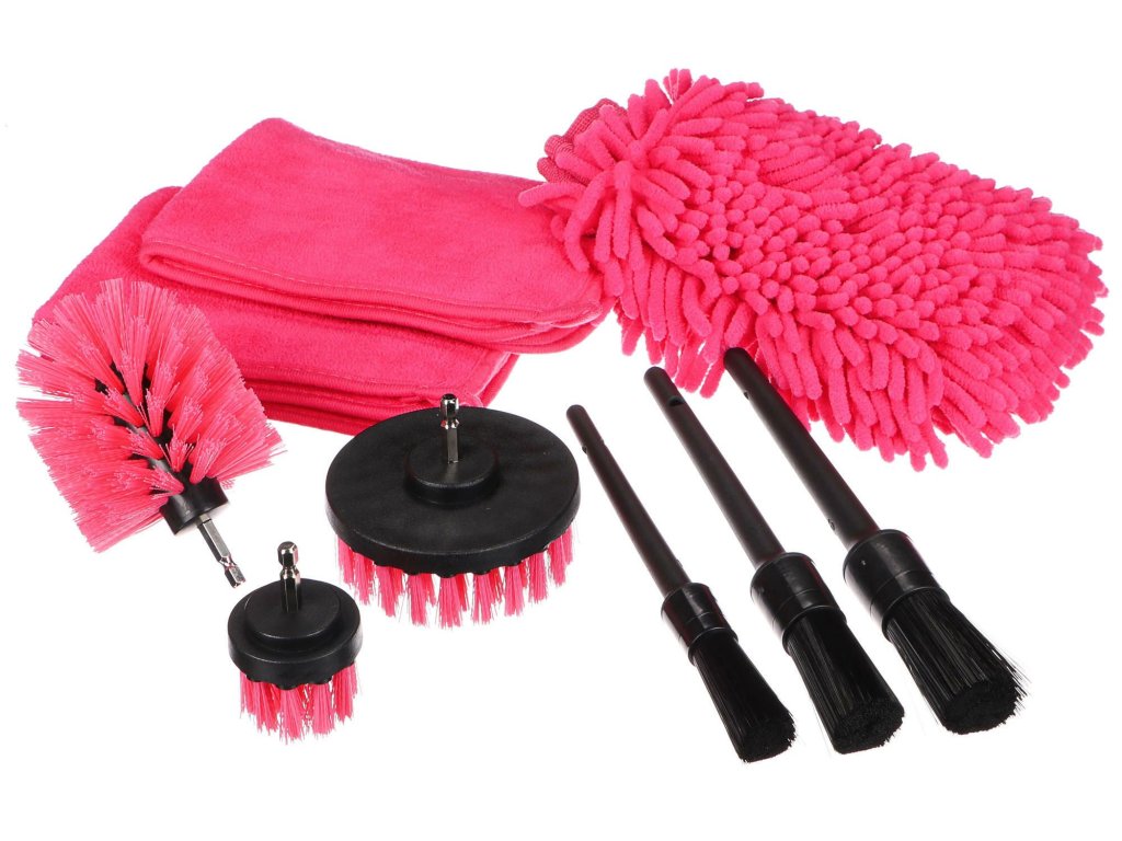 Všestranná sada čistících a mycích nástrojů CAR DETAILING PINK 9 vám pomůže s kompletní údržbou povrchů interieru a exterieru vašeho vozu. Sada obsahuje detailní nylonové štětce na čištění špatně dostupných míst jako jsou záhyby ve dveřích a středovém panelu, rukavici na mytí exterieru vašeho vozu, kartáče na vrtačku různých velikostí pro čištění kovových částí a utěrky z mikrovlákna pro zachování lesku. Celá sada je uložena v praktické přenosné brašně na zip. Díky sadě CAR DETAILING bude váš vůz zářit čistotou.