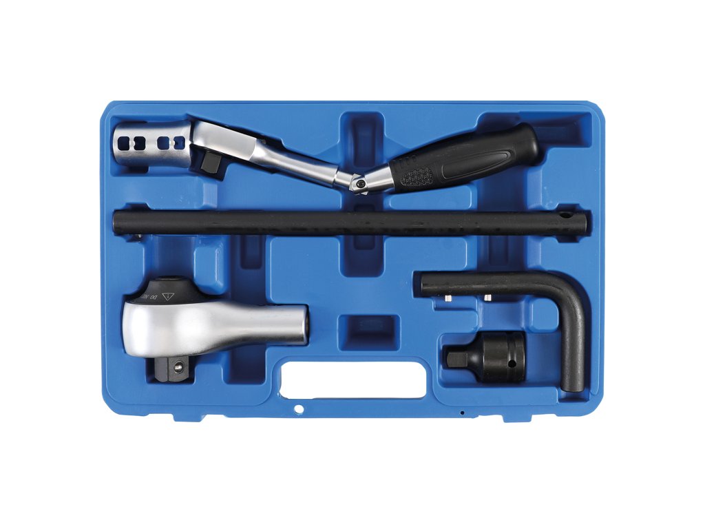 Dodáváno v sadě s ráčnou a dvěma tyčemi (např. pro práci s kolovými šrouby nákladních vozidel).