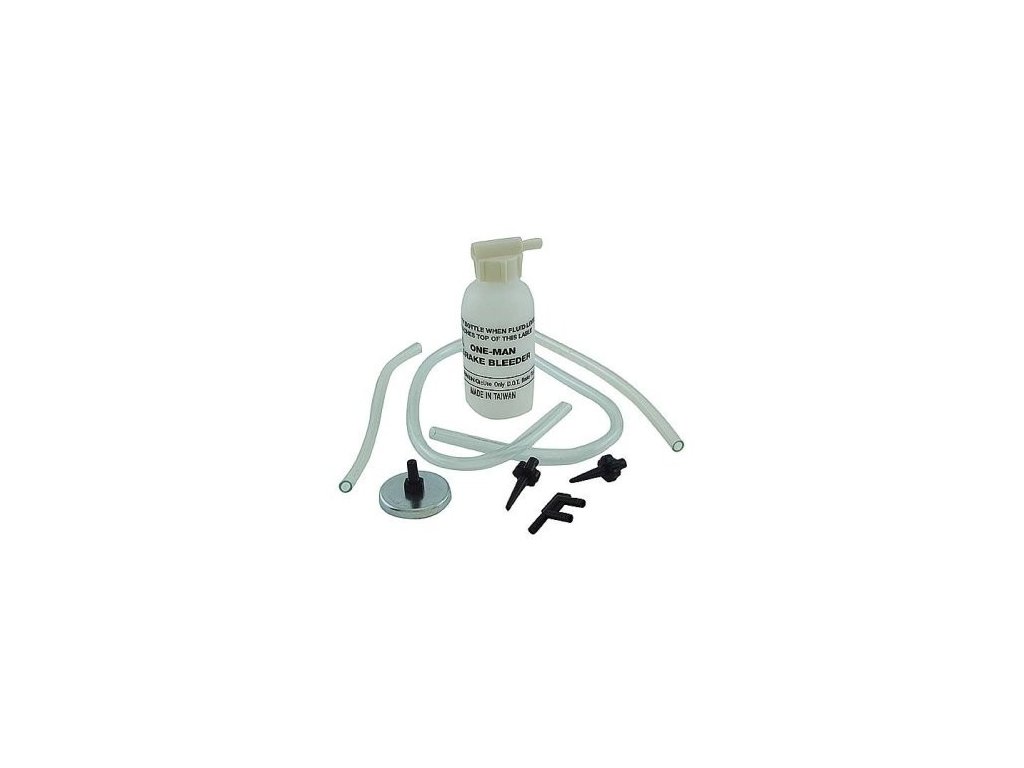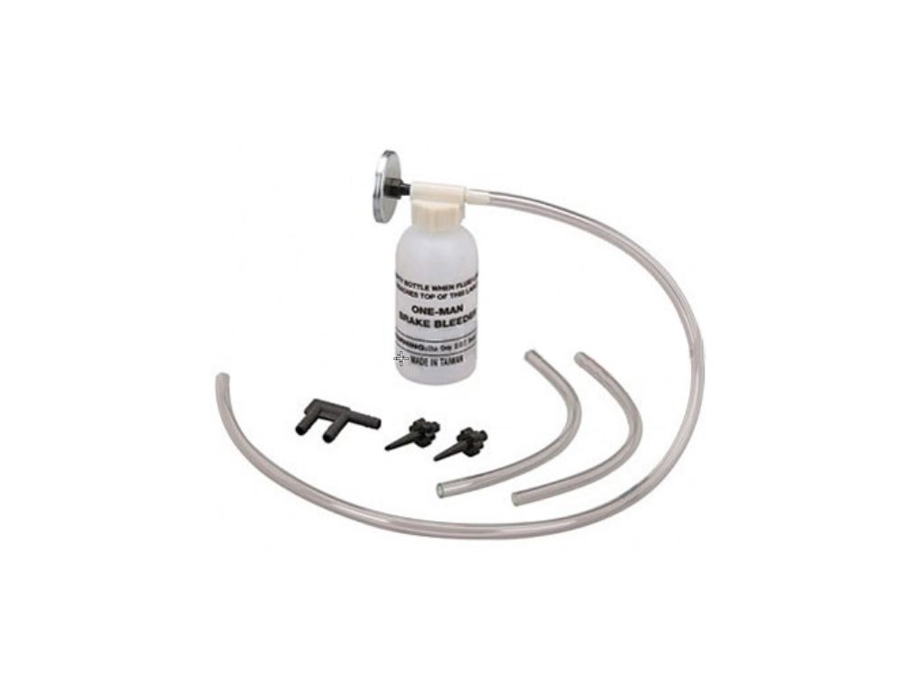 Účelnou sadu pro odvzdušňování brzd jen jedním mechanikem tvoří speciální plastová nádobka pro brzdovou kapalinu, 3 umělohmotné hadičky a 3 připojovací adaptéry. Nádobka je opatřena silným magnetem, takže ji lze snadno upevnit na běžný kovový povrch.