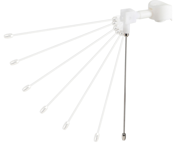 Se sklopenou rozprašovací jehlou vytváří mlhu, s vyklopenou jehlou vytváří úzký proud.