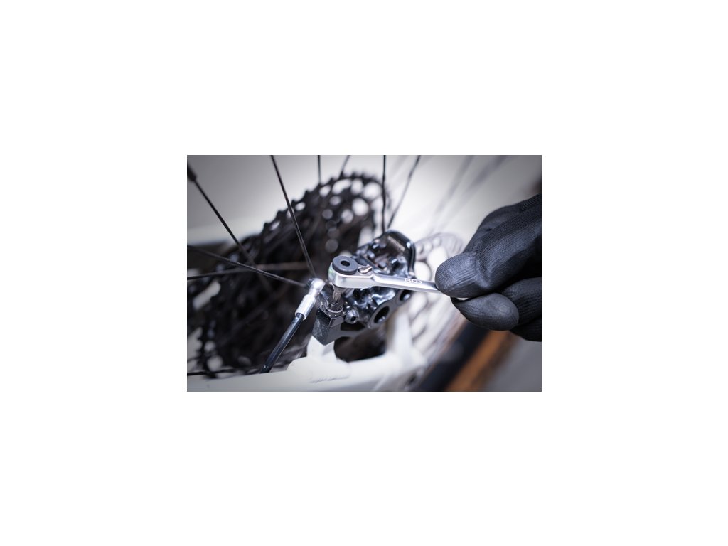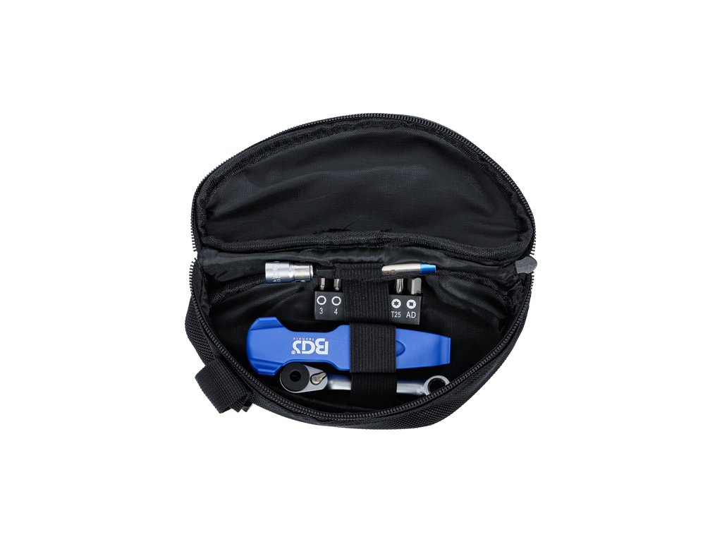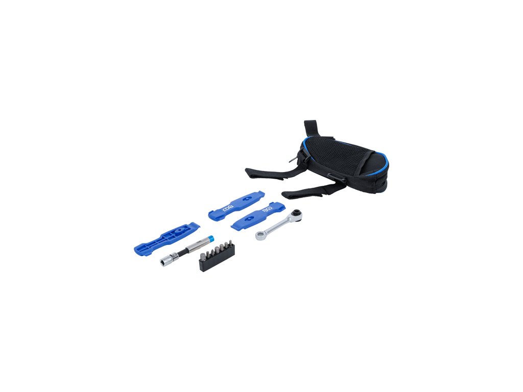 Veškeré nářadí je uloženo v praktické brašně s možností upnutí na rám, sedlo nebo sedlovku