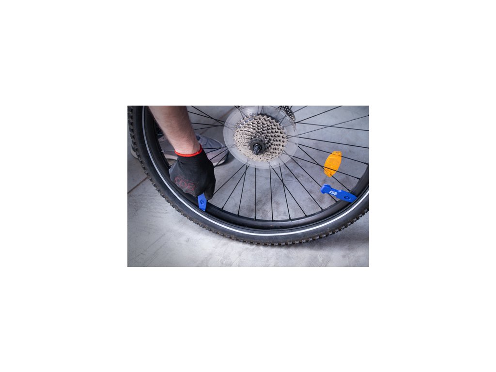 3 plastové montážní páky na cyklistické pláště, které lze připevnit k ráfku a umožňují přístup k netěsným místům v duši