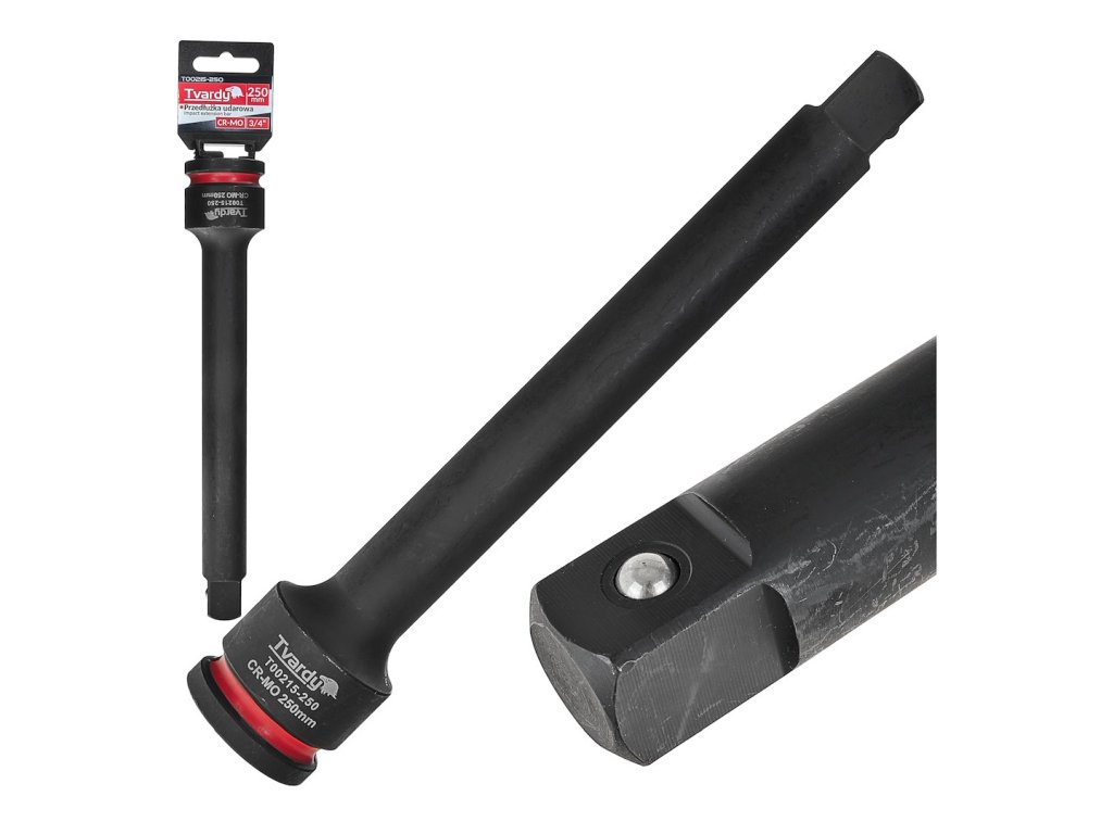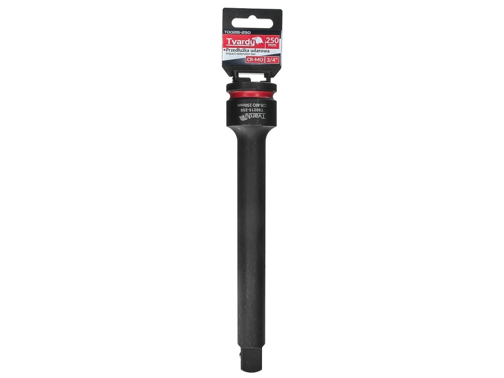 Profesionální prodlužovací tyč Tvardy 250 mm s 3/4” pohonem, speciálně navržená pro použití s rázovými utahováky. Nezbytná, když se šroub nebo matice nachází na těžko přístupných místech, jako jsou hluboké výklenky motoru, zavěšení nebo ocelové konstrukce.