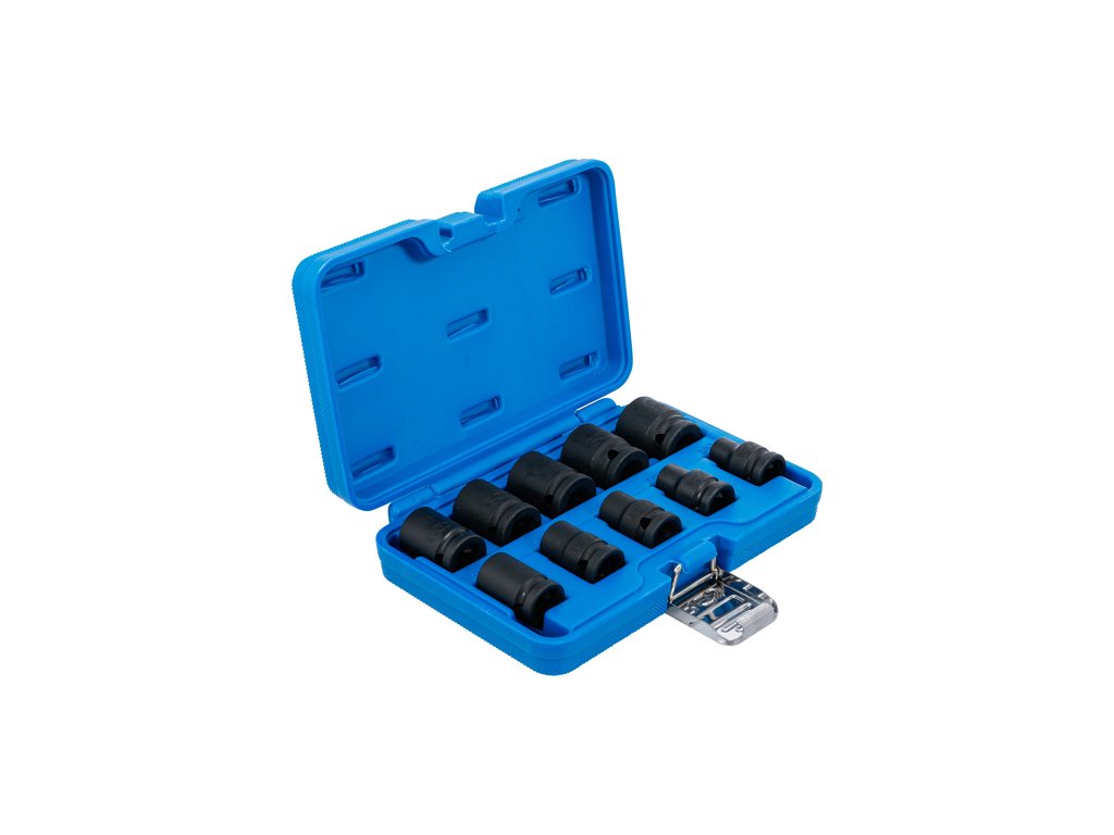 Sada nástrčných hlavic v palcových (imperiálních) rozměrech, vodicí 4hran 1/2“, úderové – pro rázové utahováky, 10 kusů v plastové kazetě – BGS Technic 74296
