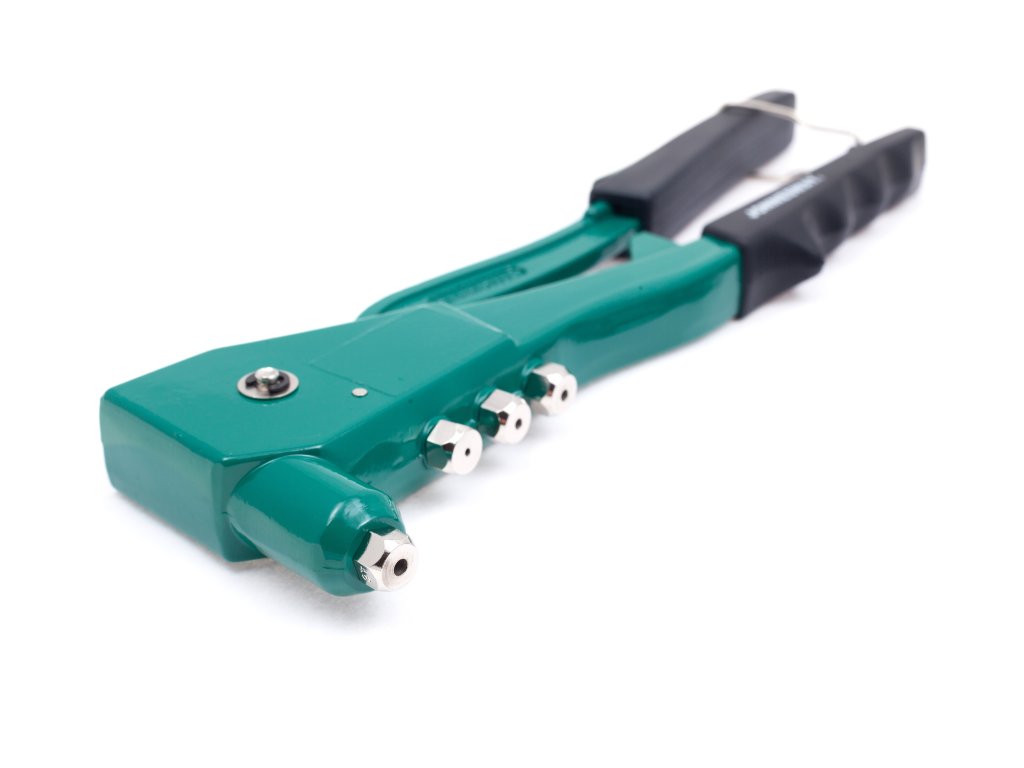 Tento odolný celoocelový ruční nýtovač umožňuje snadnou výměnu velikosti nýtů. V rukojeti nýtovačky jsou uloženy čtyři nástavce a klíč. Pohodlná gumová PVC rukojeť snižuje únavu ruky a zabraňuje vyklouznutí kleští.