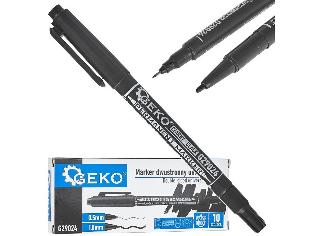 Spolehlivý voděodolný fix s dvojitou špičkou je praktickým nástrojem pro každodenní použití – doma, v kanceláři nebo v dílně. Díky dvěma špičkám různé tloušťky (0,5 mm a 1,0 mm) umožňuje fix jak přesné psaní, tak jasné značení povrchů.