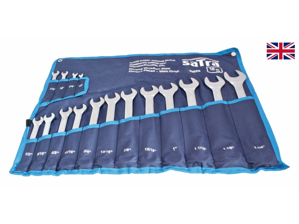 Sada očkoplochých klíčů v palcových rozměrech, 16 kusů v látkovém obalu s očky na zavěšení – SATRA IN926