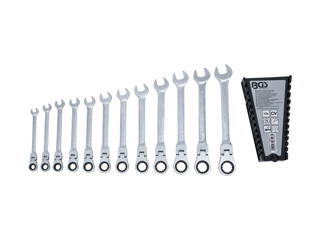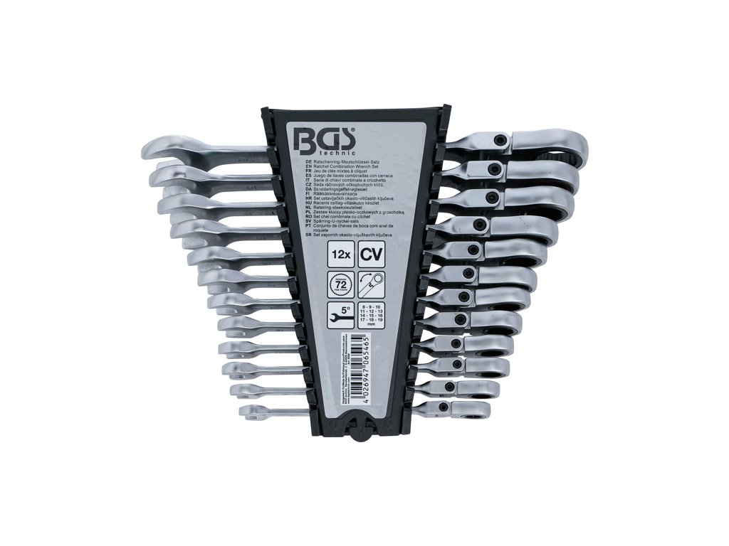Sada kloubových (výkyvných) očkoplochých ráčnových klíčů, rozměry 8 až 19 mm, 12hranný profil očka, sada 12 dílů v plastovém pořadači - BGS technic 6546