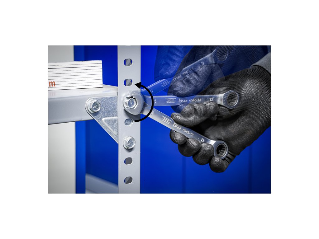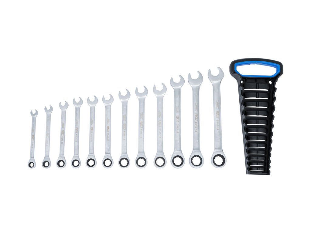 Sada očkoplochých ráčnových klíčů, rozměry 8 až 19 mm, 12hranný profil očka, sada 12 dílů v plastovém držáku s madlem - BGS technic 6545