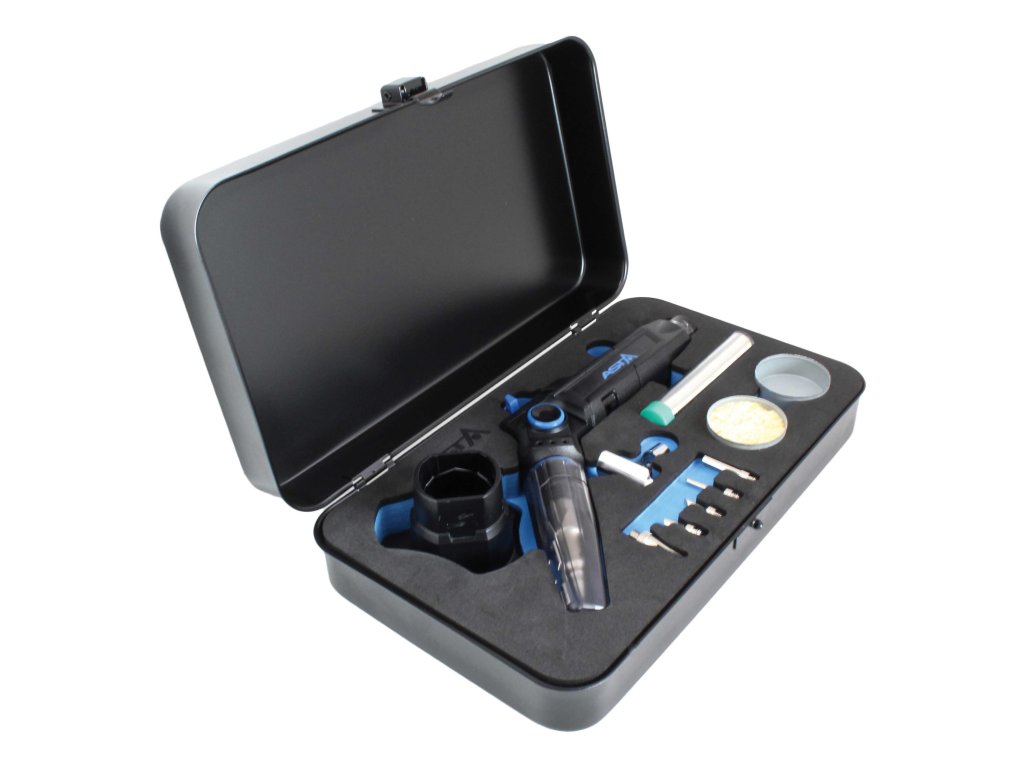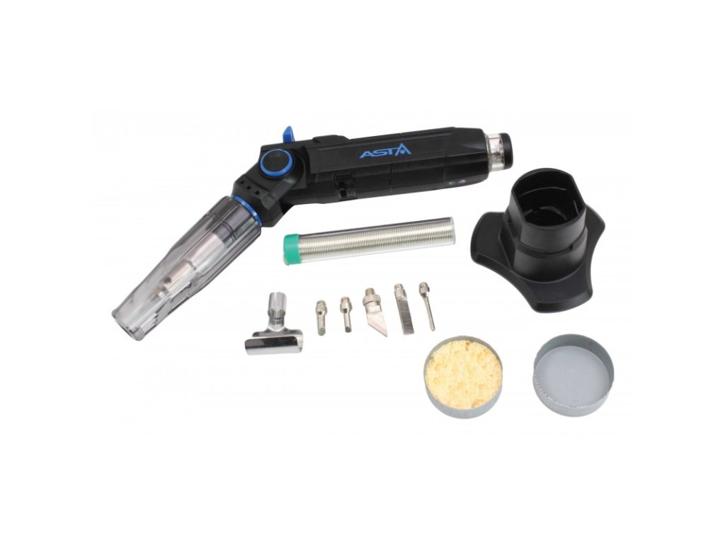 Plynová univerzální páječka (pájka) s kloubovou konstrukcí, na kapalný butan, se sadou 7 nástavců, stojanem a pájecí kalafunou, dodáváno v plastové kazetě – ASTA A-PT39SE