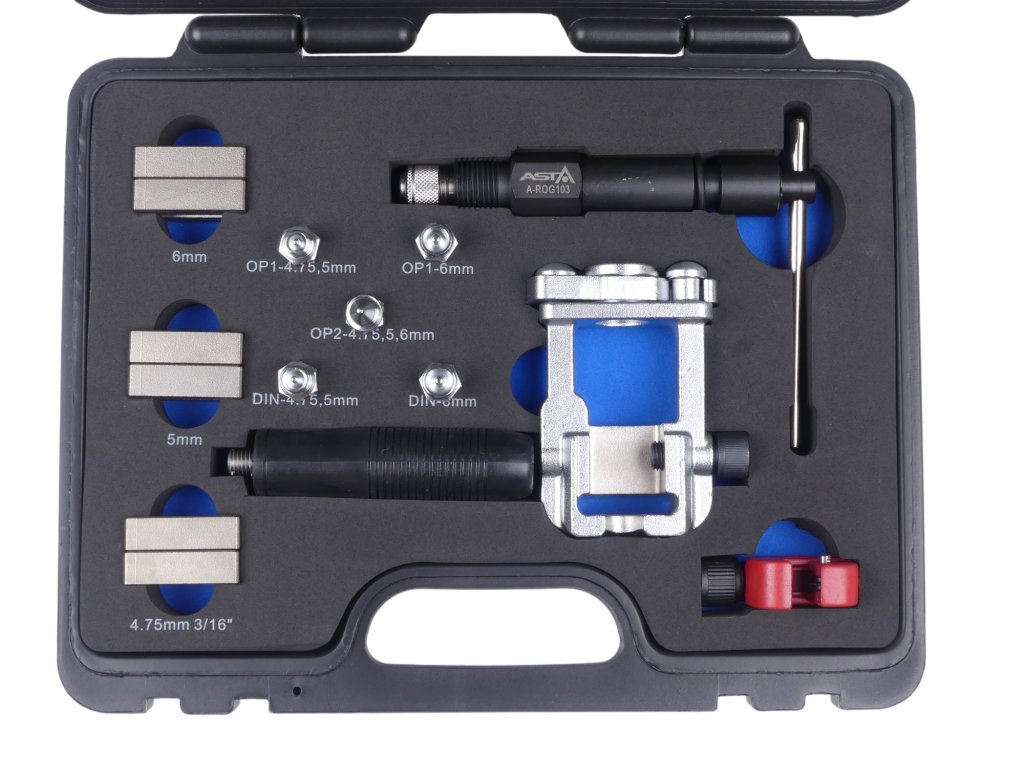 Sada na úpravu – pertlování konců brzdového potrubí automobilu, s hydraulickým vřetenem, sada v plastovém kufru – ASTA A-ROG103.
