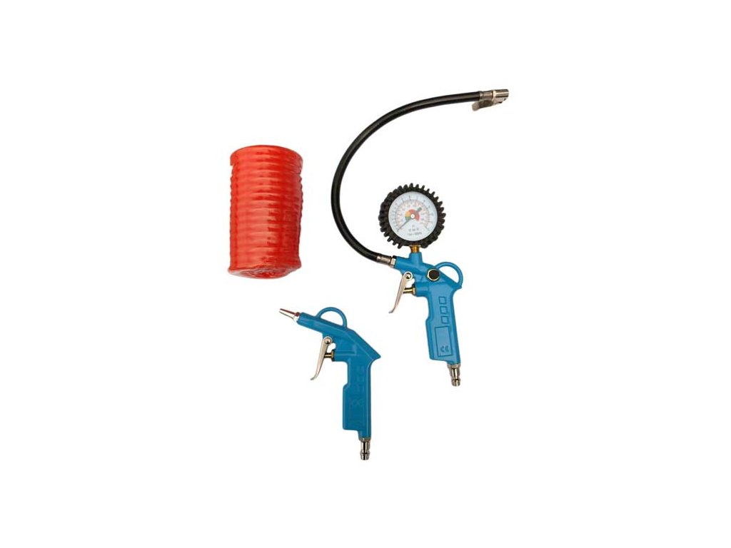 Souprava pro práci se vzduchovým kompresorem. Ideální na huštění pneumatik, bazénů nebo člunů, profukování vzduchových filtrů, ofukování pilin, prachu a dalších nečistot.