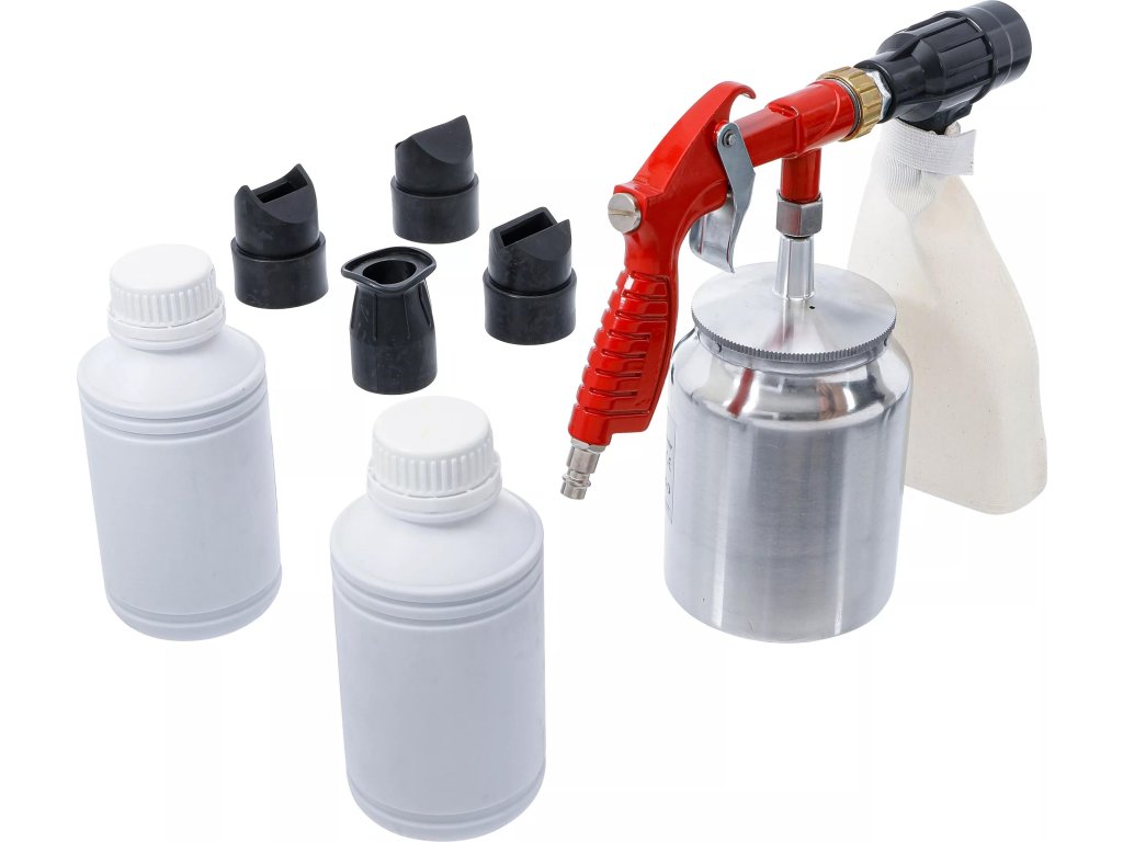 V sadě je dodáváno vše, co potřebujete: pistoli stačí naplnit, připojit ke zdroji stlačeného vzduchu a začít pracovat.