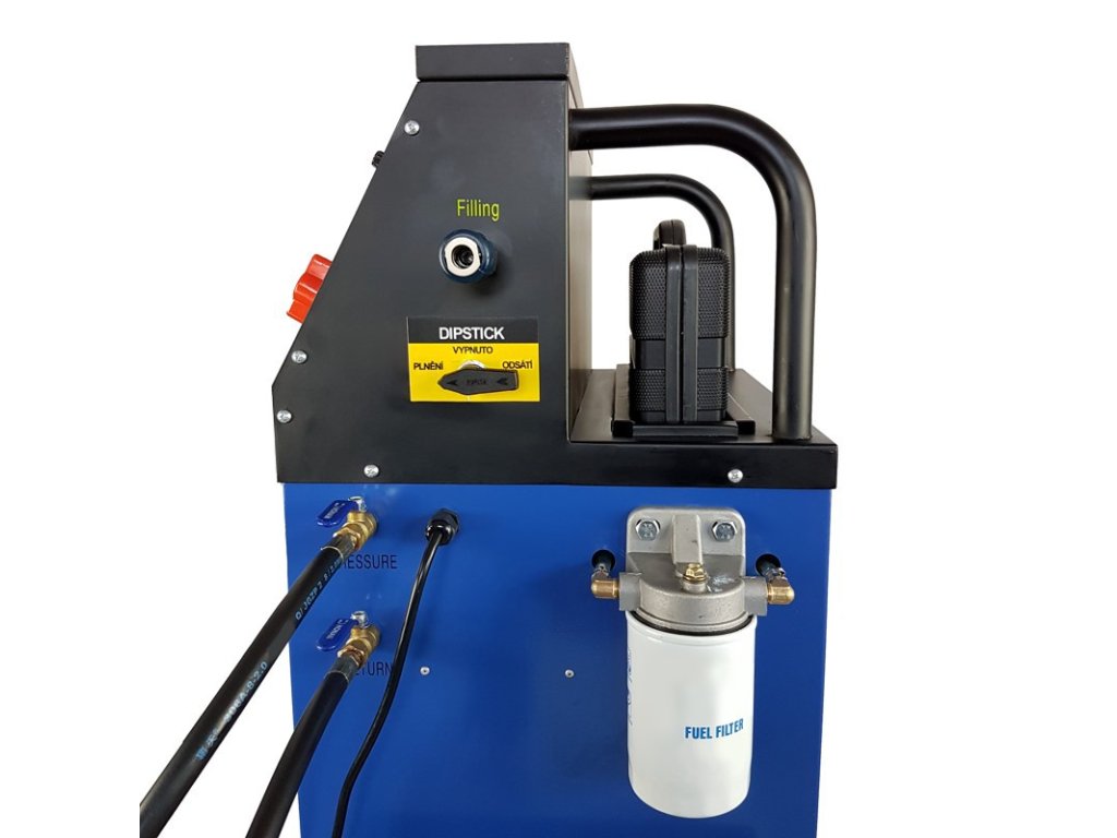 Přístroj má nádrže objemu 25 litrů na nový a použitý olej, s vizuálními stupnicemi pro kontrolu množství kapaliny. Je vybaven olejovým filtrem, průtokoměrem nového i použitého oleje, pneumatickým čerpadlem a měřiči tlaku.