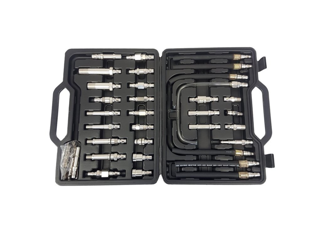 Sada obsahuje základní univerzální sadu připojovacích adaptérů v kufříku s možností uložení do speciální přihrádky v zadní části plničky. Sadu tak máte vždy pohromadě.