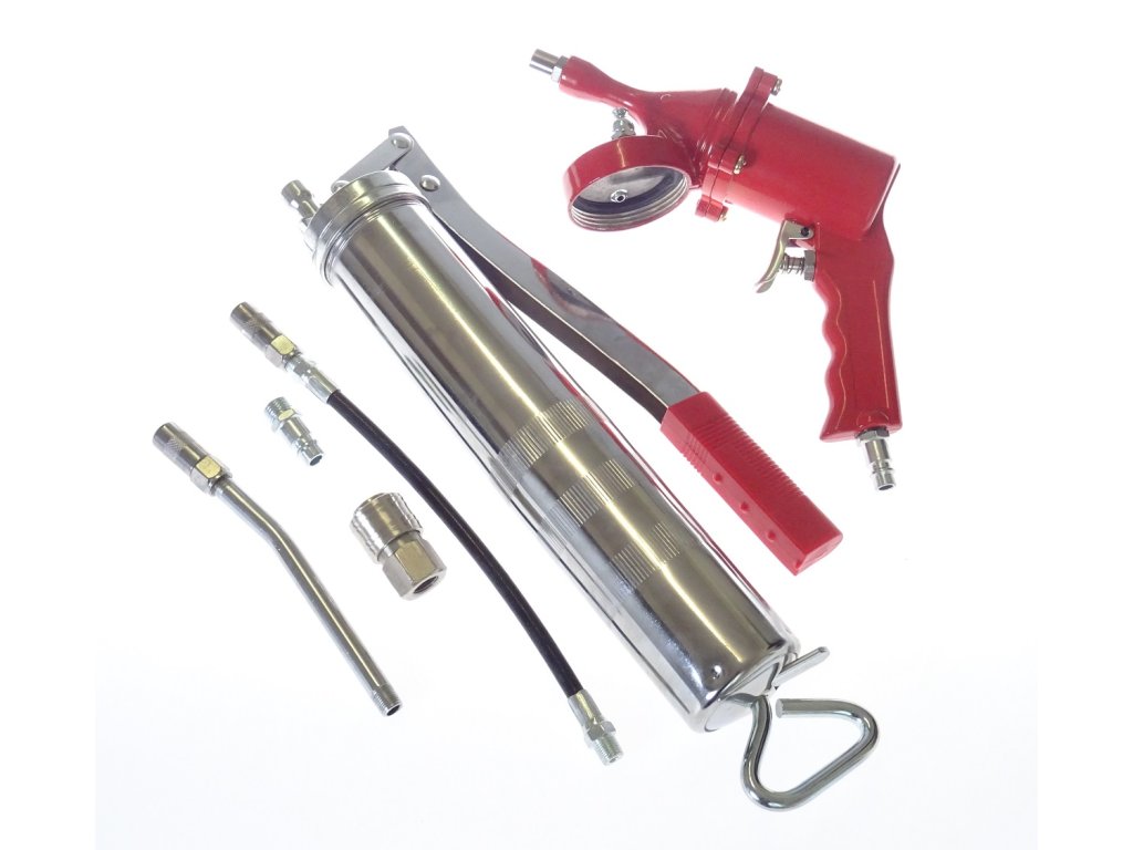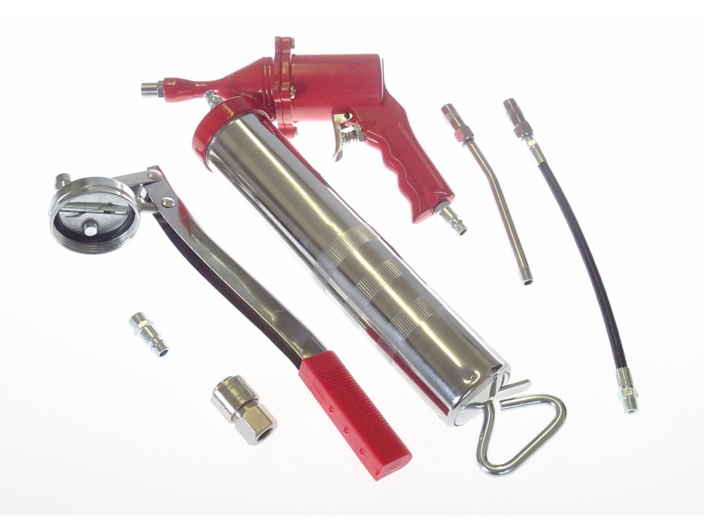 Lis má dvojí pohon: mazivo lze vytlačovat pneumaticky připojením k dílenskému kompresoru, nebo ručním tlakováním pákou. Oba adaptéry lze snadno vyměnit přešroubováním.