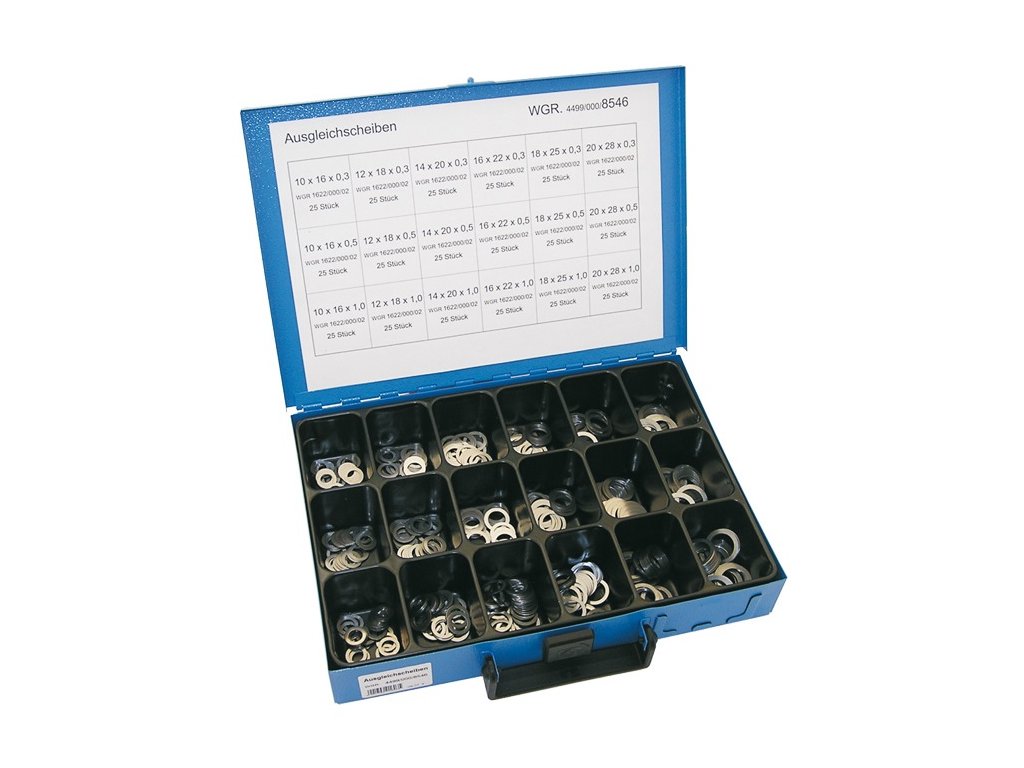 Ploché podložky pod šrouby univerzální, různé rozměry, tloušťky 0.3, 0.5 a 1 mm, sada 450 kusů v plechovém kufru – Dresselhaus 44990008546