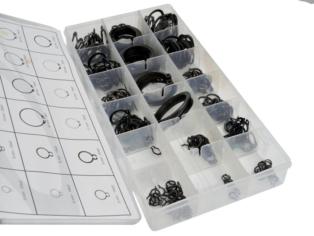 Sada 300 vnějších kroužků Seeger ve velikostech 3–32 mm.