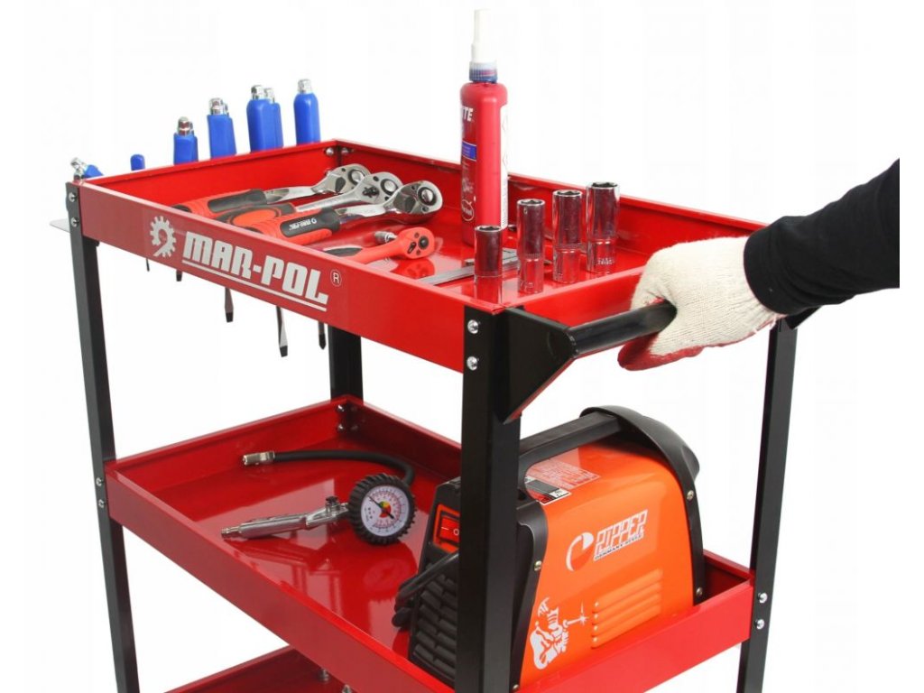 Ocelový vozík se třemi policemi je ideální pro dílny a služby a je také dobrým řešením pro kutily.