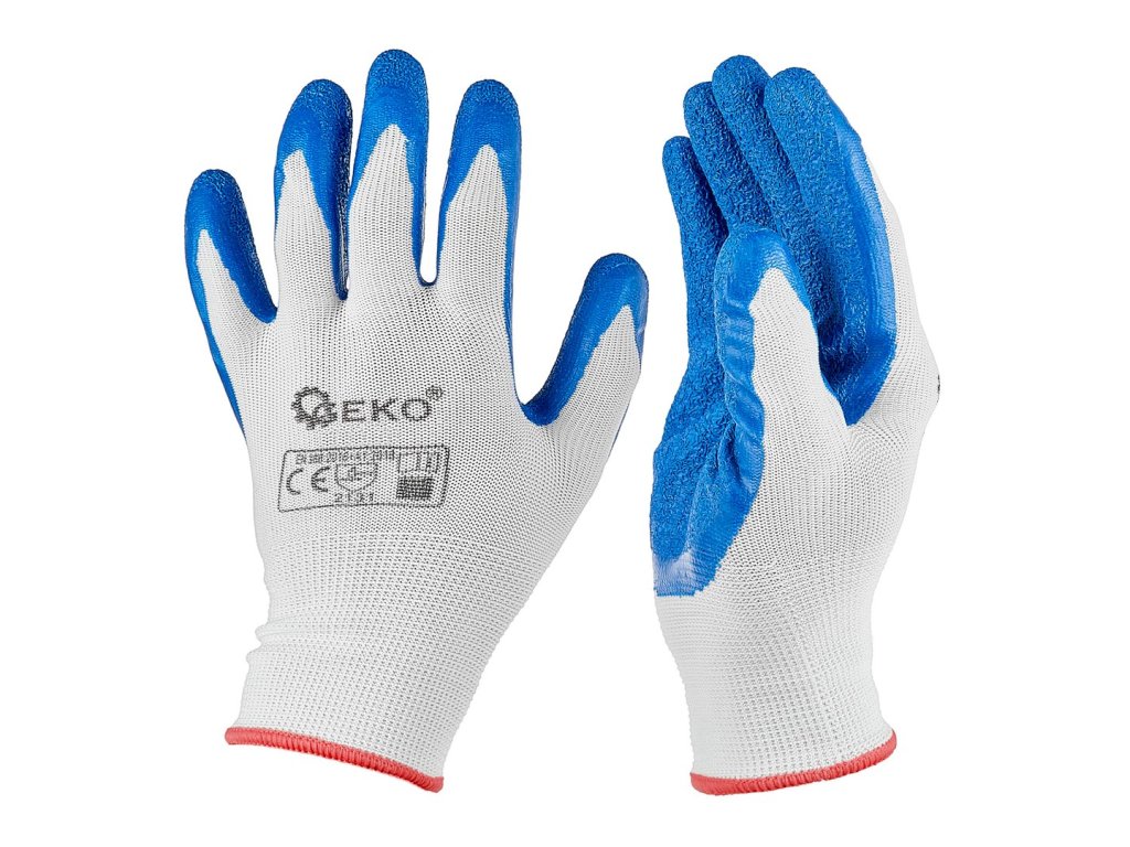 Tyto rukavice jsou vyrobeny z pružného bílého polyesterového úpletu a potaženy modrým latexem. Poskytují vynikající přilnavost, prodyšnost a pohodlí při nošení.