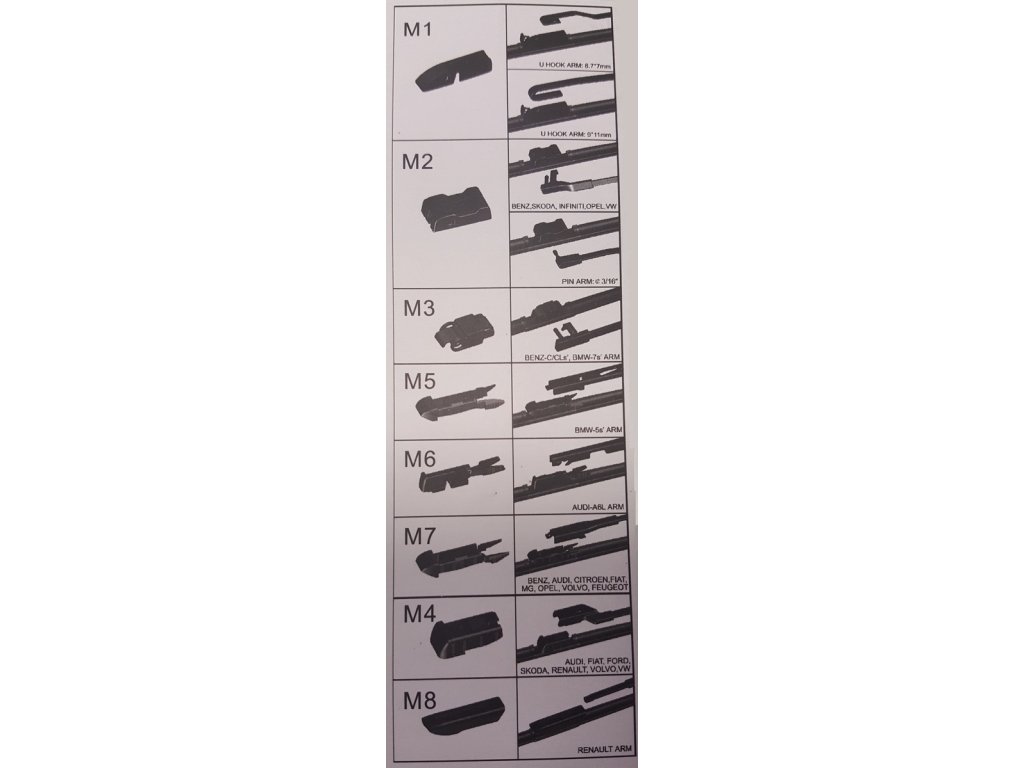 Vysoce kvalitní plochý stěrač se sadou adaptérů pro většinu ramének typu hak, s čepem a ploché.