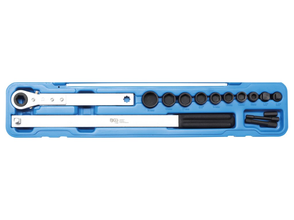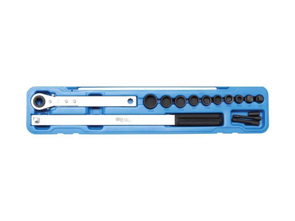 Speciální klíč na montáž a demontáž drážkovaných klínových řemenů, s ráčnou, metrické a palcové hlavice, 10dílná sada v plastové kazetě – BGS technic 1706