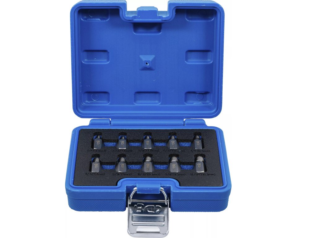 Sada přípravků „Twist“ na povolení šroubů s poškozeným vnitřním profilem hlavy, průměry 3-11 mm, 10dílná, v plastové krabičce – BGS 8547