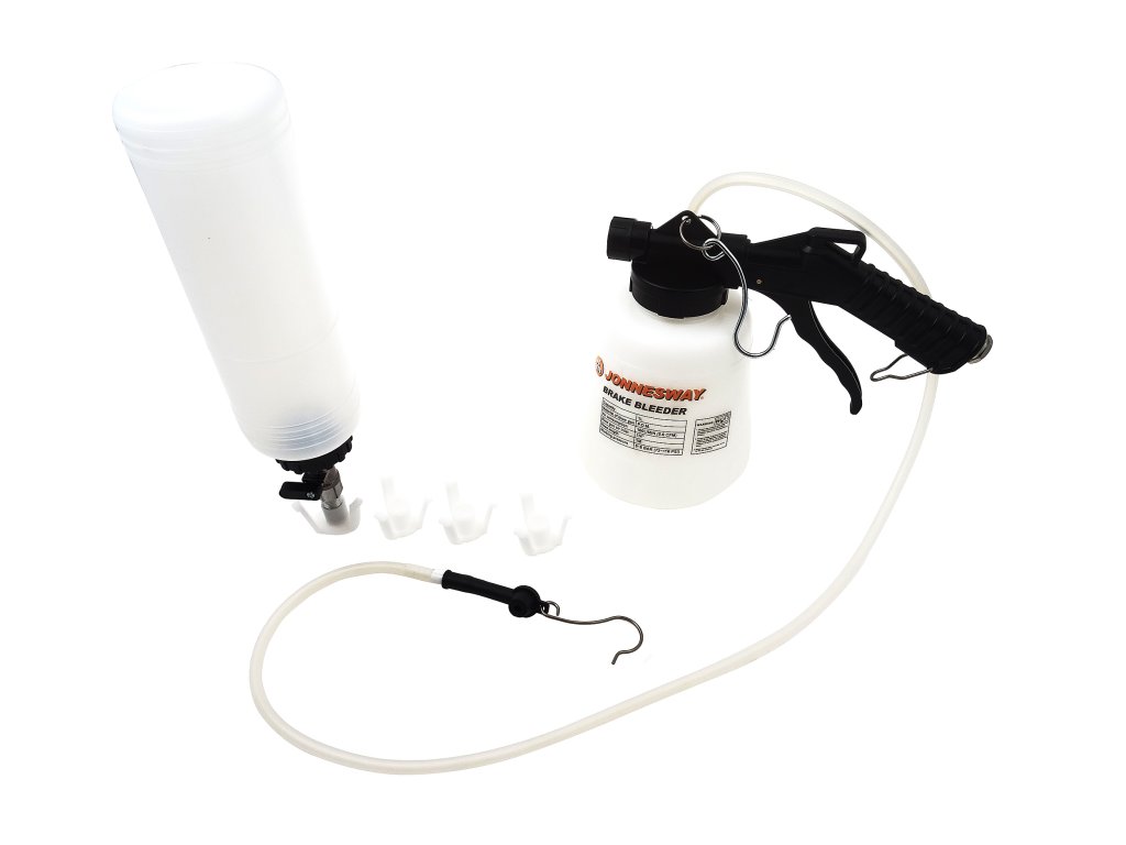 Odsávačka na podtlakové odvzdušnění brzd bez pomocníka, plnící nádoba (0,75 l), odsávací nádoba (1 l), 4 adaptéry – JONNESWAY AE300214