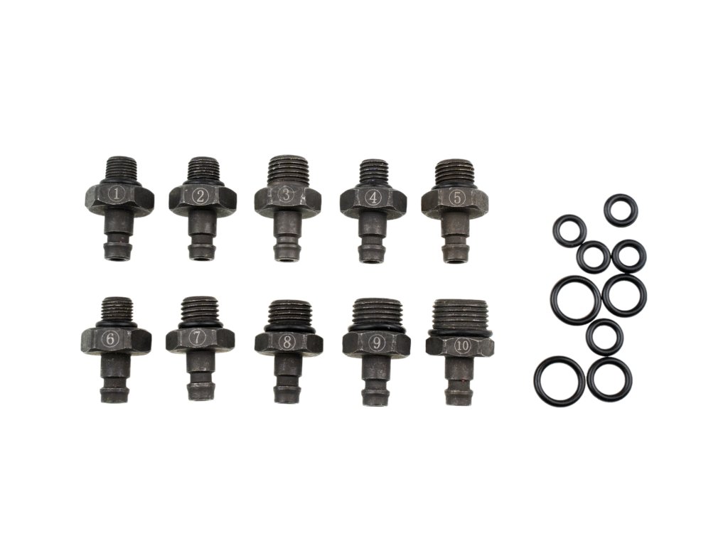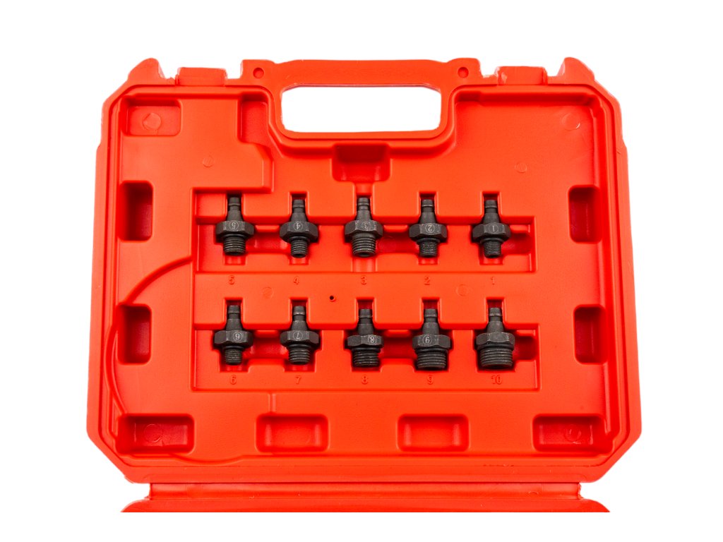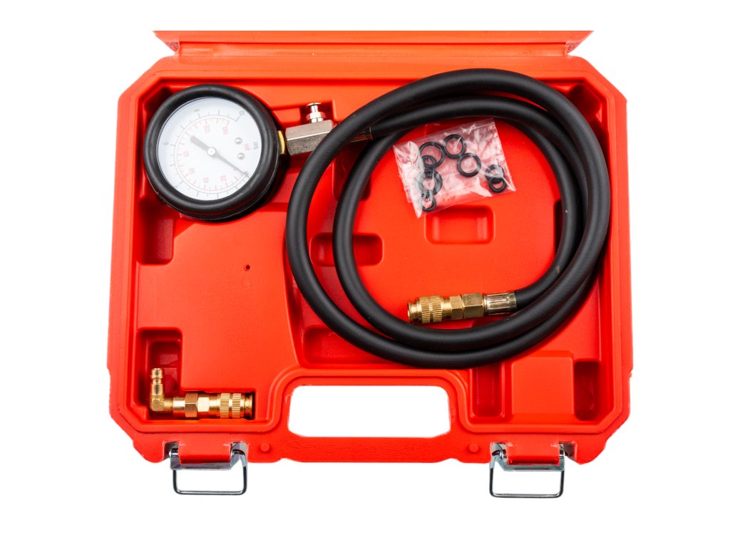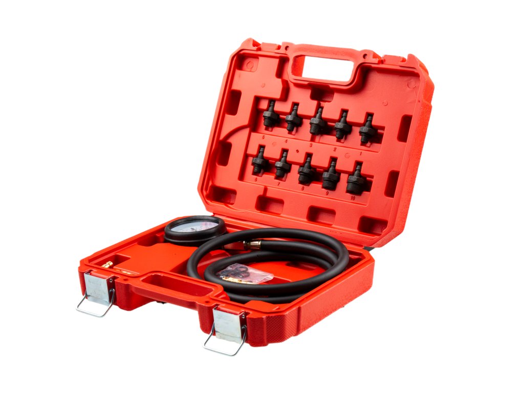 Obsahuje analogový měřák tlakoměr oleje s rozsahem 0-10 bar (0-140 psi) a připojovací gumovou hadicí délky 120 cm, pravoúhlé kolínko do hůře přístupných míst, sadu těsnění a 10 různých koncovek pasujících do většiny běžných osobních a dodávkových auto, včetně některých nákladních automobilů.