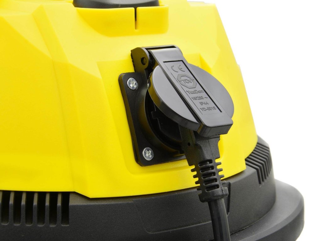 Součástí vysavače je zásuvka pro připojení elektrického nářadí, například pro vrtání a vysávání zároveň.