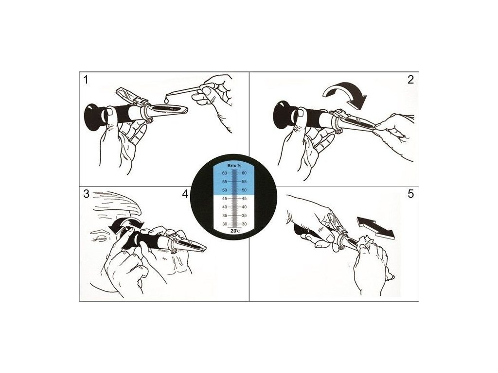 Měření refraktometrem je velmi jednoduché, stačí kápnout kapku měřené látky na zešikmený optický hranol přístroje, přiklopit krytku hranolu (látka se rozprostře), podívat se proti světlu do okuláru přístroje, případně ho zaostřit a na příslušné stupnici. V zorném poli lze ihned odečíst hodnotu cukernatosti (%) podle rozhraní mezi osvětlenou a neosvětlenou částí. Velká, dobře čitelná stupnice pro obsah cukru v % (0 – 32 % Brix) s možností doostření stupnice.