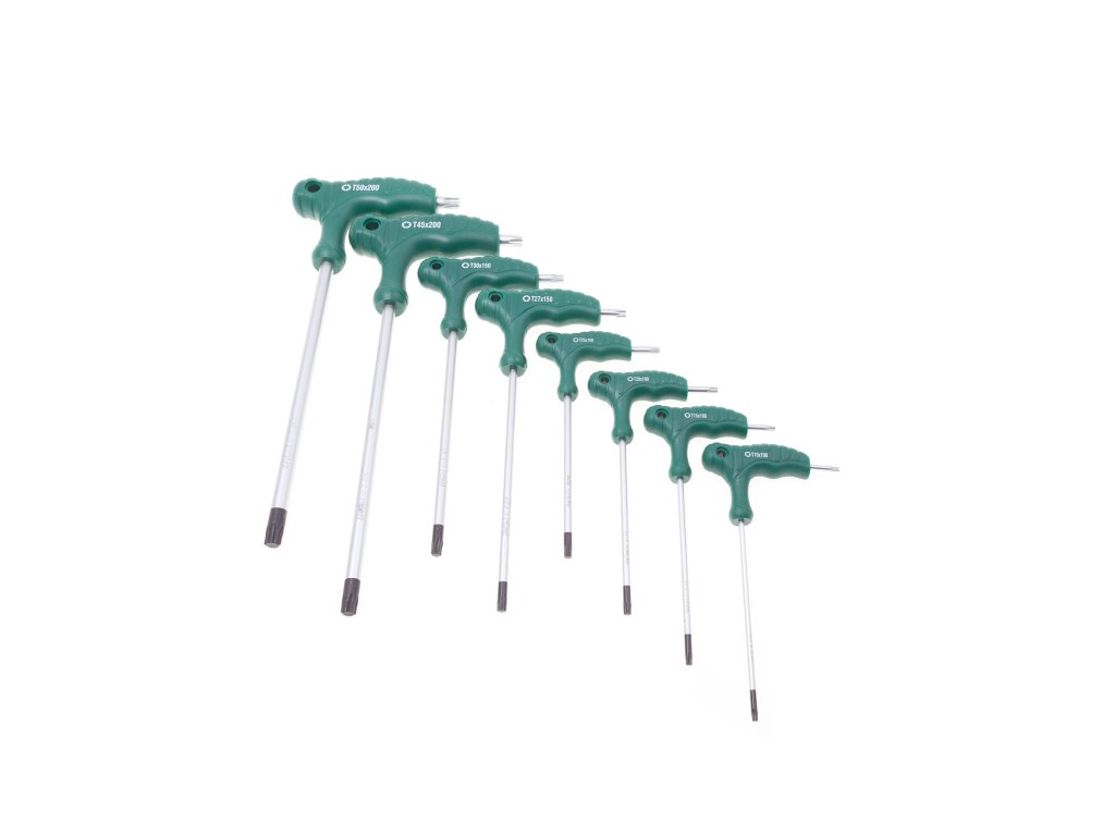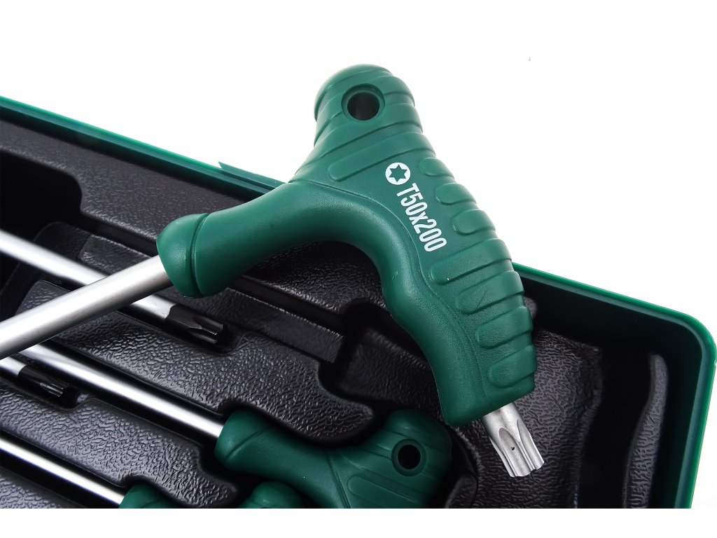 Plastové ergonomické rukojeti ve tvaru T pro pohodlnou práci. Rukojeť má očko např. pro zavěšení na zeď. Delší část dříku má plný konec (klasický TORX), kratší je s otvorem (na bezpečnostní Torx šrouby typu Torx Tamper-proof – TT).