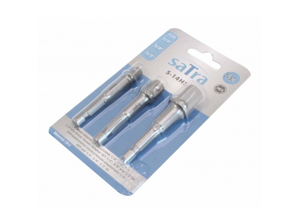 Adaptéry na gola nářadí, do vrtačky, čtyřhran 1/4” 3/8” 1/2”, šestihran 1/4", 3 ks - SATRA